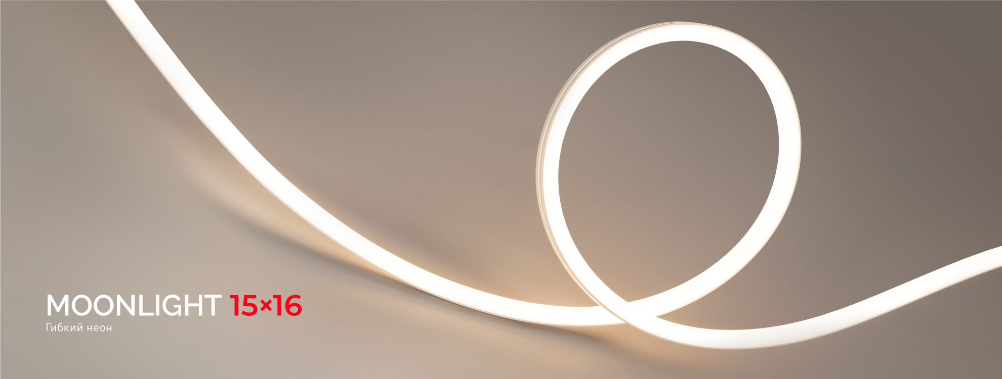 Гибкий неон MOONLIGHT с куполообразным сечением 16×15 мм — отличное решение для декоративного оформления интерьеров, фасадов зданий, рекламных конструкций и уличных пространств.
