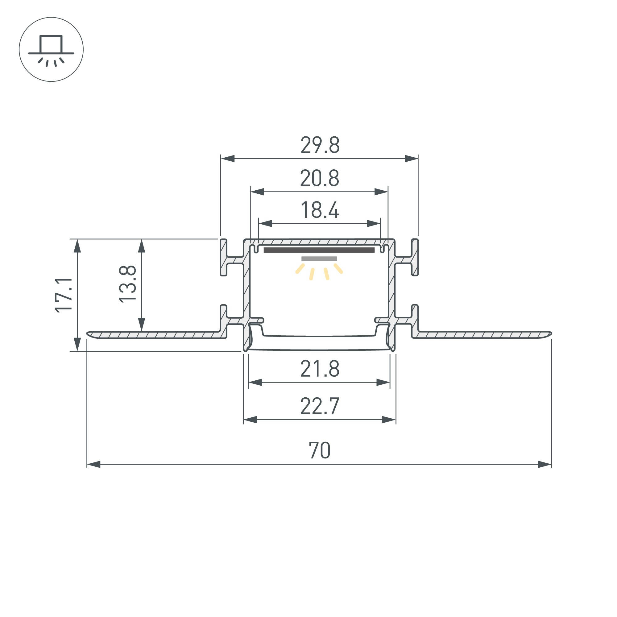 Алюминиевый встраиваемый гибкий профиль для светодиодных лент и линеек. Изгиб вправо/влево. Минимальный радиус изгиба 50 см. Габаритные размеры (L×W×H): 2000х70х17,1 мм. Ширина площадки для ленты 17 мм. Экраны, заглушки и другие аксессуары приобретаются отдельно. Цена за 1 метр.