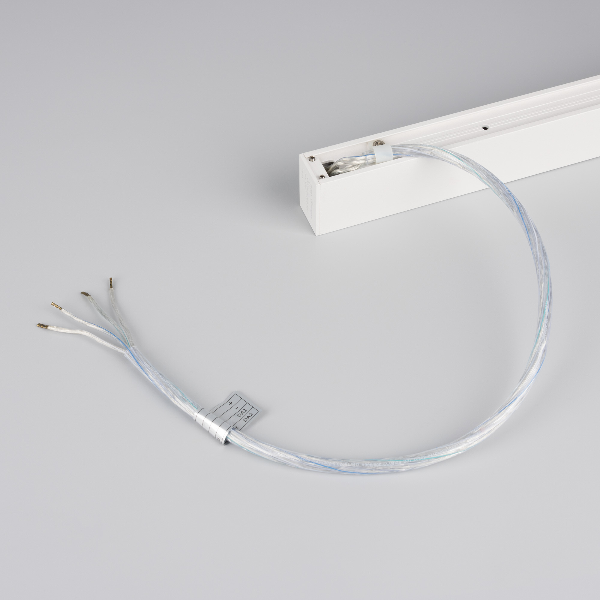 Подвесной, накладной магнитный трек, длина 3000 мм. DC24V, позволяет диммировать светильники по протоколу DALI. Материал алюминий, цвет белый. Две заглушки в комплекте. Размер ДxШxВ: 3003x25x38 мм. Размер (с учетом заглушек). Аксессуары для подвесного монтажа в комплект не входят. К плате идет провод 24В длиной 1м.