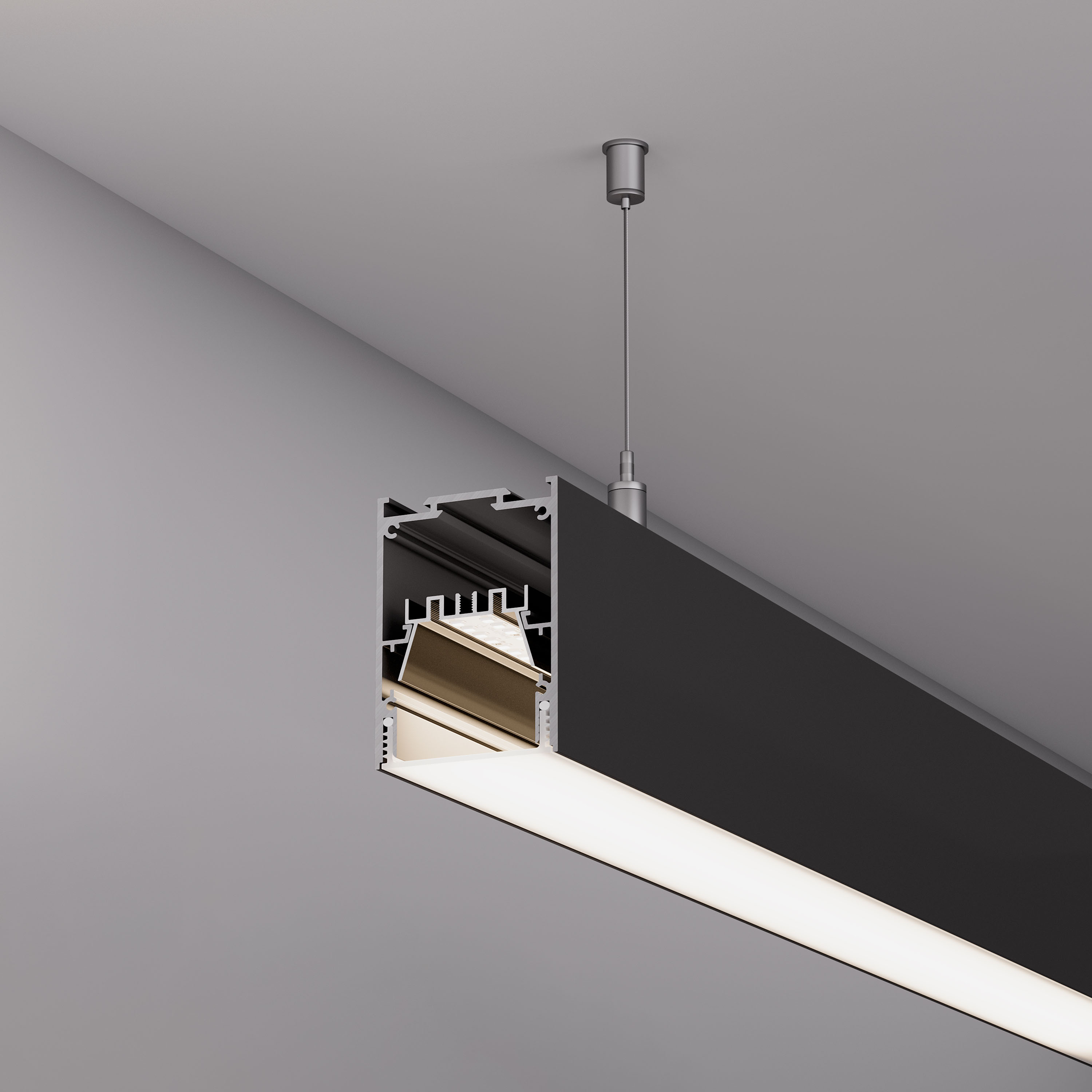 Подвесной профиль из алюминия черного цвета для основного освещения с возможностью герметизации до IP54 с помощью аксессуаров к профилю (уплотнительная резинка, заглушки, экраны, муфты) без дополнительного использования силиконового герметика, до IP65 с помощью аксессуаров к профилю (уплотнительная резинка, заглушки, экраны, муфты) при условии дополнительного использования силиконового герметика. Габаритные размеры профиля составляют 2000 мм в длину, 54,25 мм в ширину и 75 мм в высоту. Площадка для установки светодиодных лент позволяет использовать ленту шириной до 16 мм и мощностью до 36 Вт/м. Это обеспечивает гибкость в выборе светодиодных лент и позволяет создать потрясающие световые решения. Экран, заглушки и другие аксессуары не включены в комплект и приобретаются отдельно. Цена указана за 1 метр профиля. Отличное решение для создания современных световых проектов.