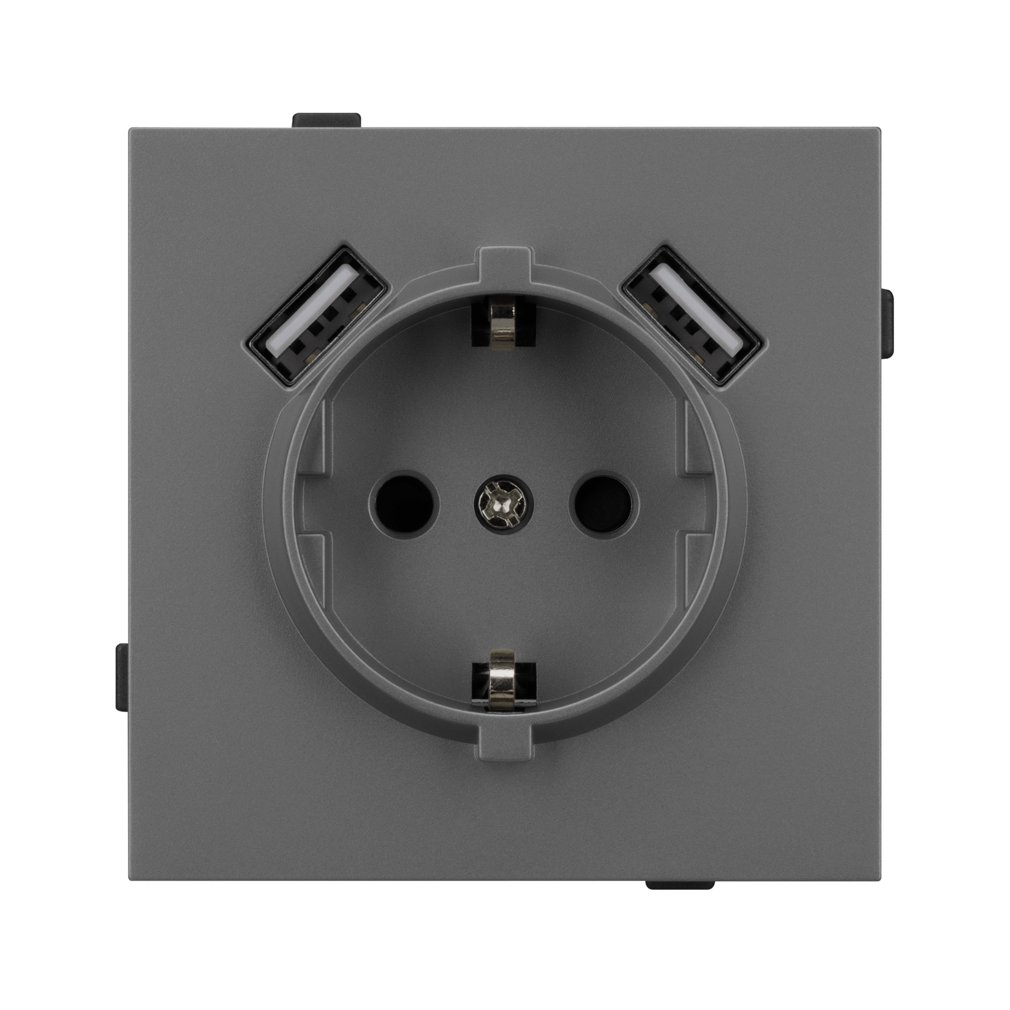 Механизм розетки с заземлением на 1 пост и 2USB Type A порта. Цвет - серый, с Soft-Touch покрытием. Без фронтальной рамки. Уровень пылевлагозащиты IP20. Розетка устанавливается в стандартный подрозетник круглого сечения диаметром 60мм.