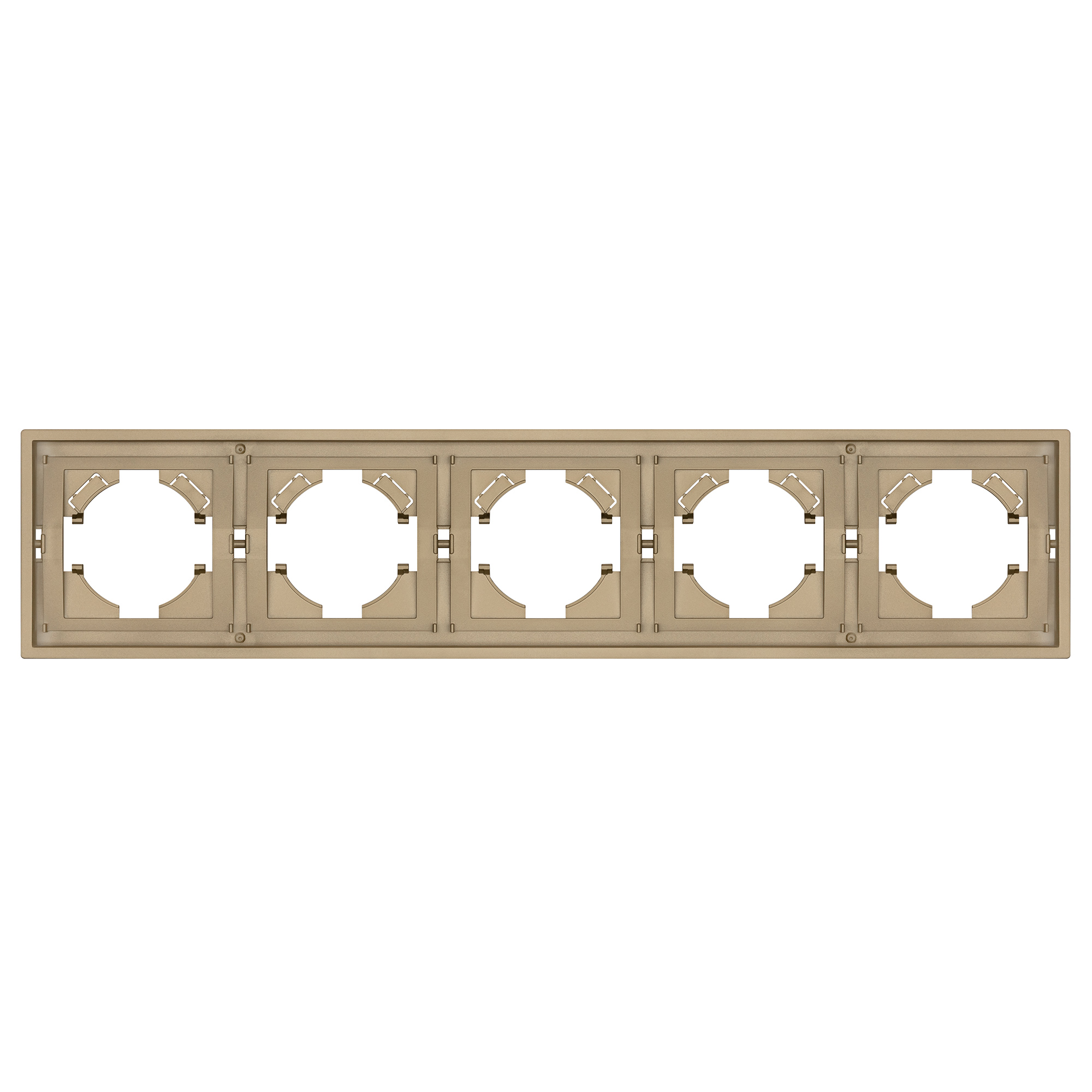 Рамка пластиковая на 5 постов, под встраиваемый механизм. Цвет - золотой, с Soft-Touch покрытием. Среднего уровня герметичности IP20. Ориентация монтажа горизонтальная.