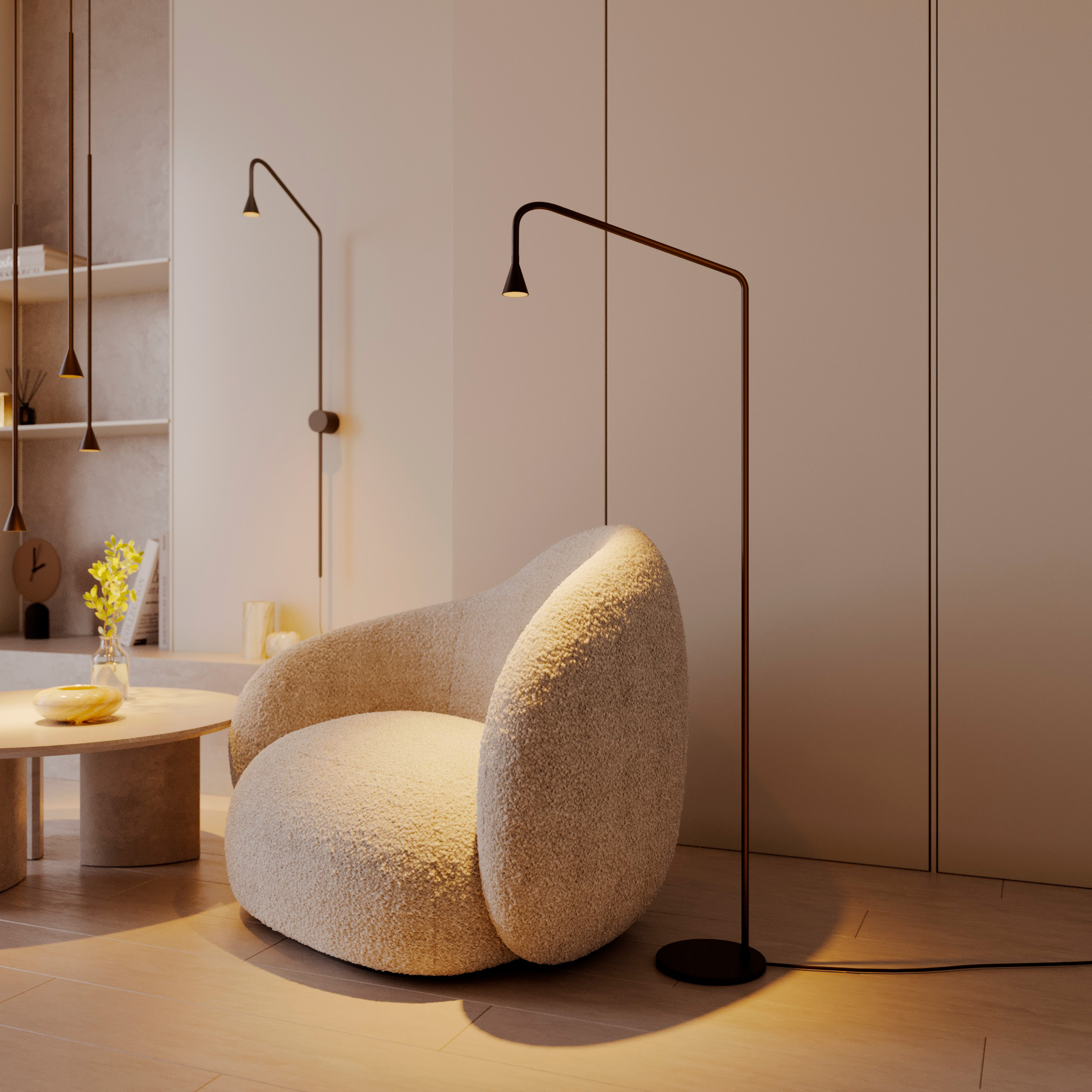 Декоративный напольный светильник. Мощность 5 Вт, св. поток 420 лм, 84 лм/Вт, теплый 3000К, CRI>94, угол 36°, напряжение питания 230 В. Черный корпус из алюминия, степень защиты IP20. Размер основания Ø200×10 мм, диаметр ножки Ø11,4, высота светильника 1400 мм, длина держателя светоизлучателя 420 мм, размер светоизлучателя Ø50×56 мм. Длина провода до выключателя 500 мм, от выключателя к розетке 1500 мм, питание от сети 220-240V. Драйвер 2-10 В, 500 мА, пульсация <1%.