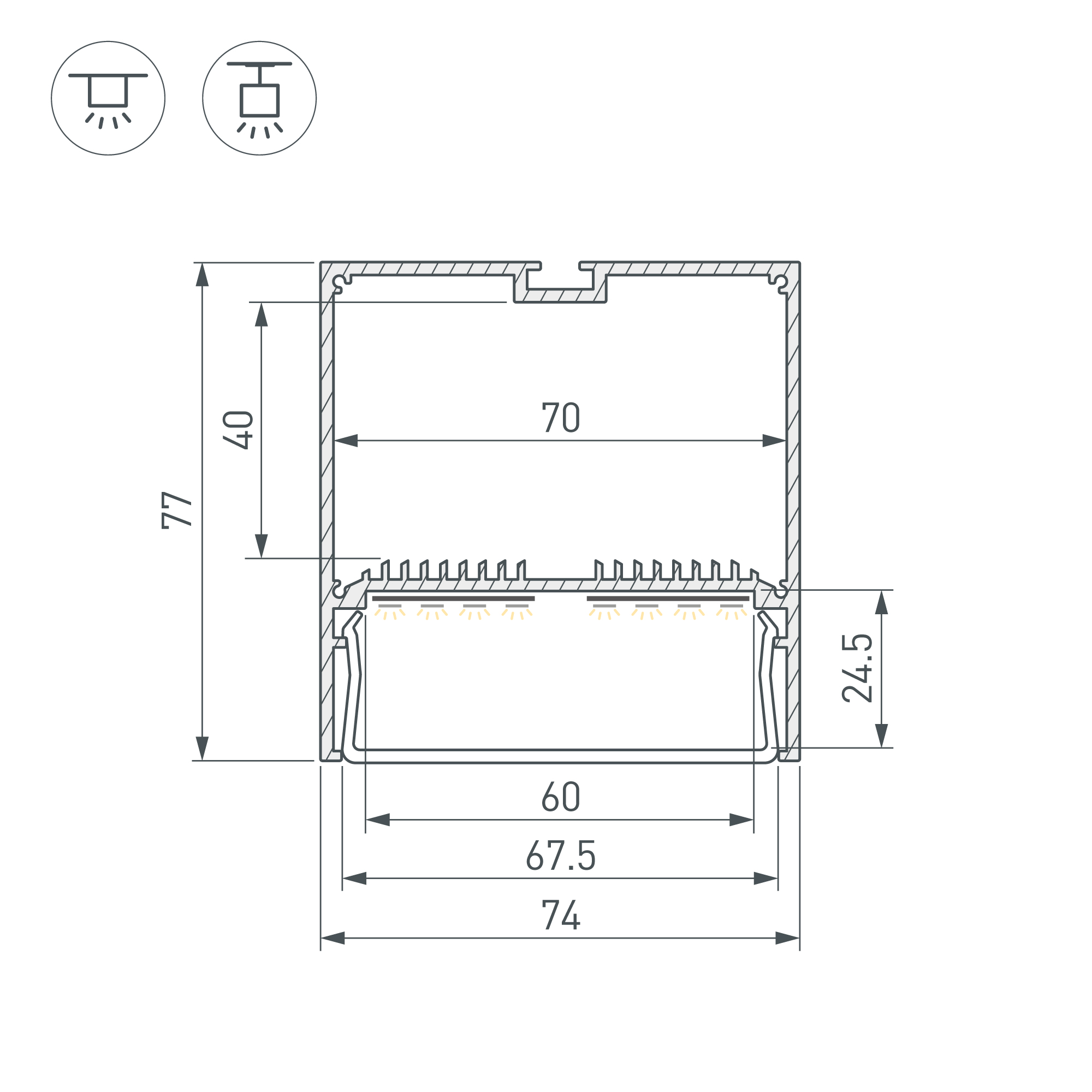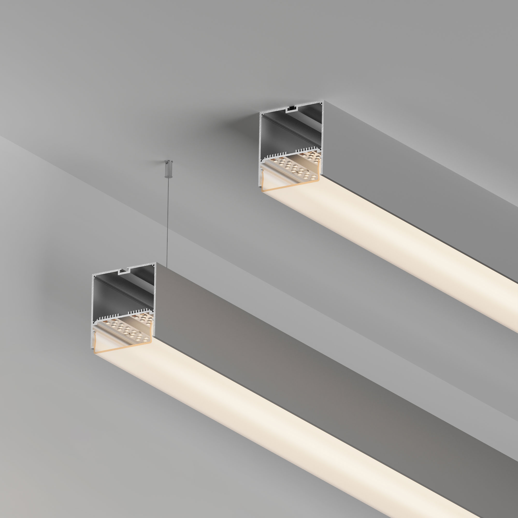 Подвесной/накладной профиль из анодированного алюминия для основной и контурной подсветки помещений. Габаритные размеры профиля составляют 2000 мм в длину, 74 мм в ширину и 77 мм в высоту. Площадка для установки светодиодных лент позволяет использовать ленту шириной до 60 мм и мощностью до 79,2 Вт/м. Это обеспечивает гибкость в выборе светодиодных лент и создает потрясающие световые решения. Монтаж осуществляется накладным либо подвесным способом. Экраны, заглушки и другие аксессуары не включены в комплект и приобретаются отдельно. Цена указана за 1 метр профиля. Отличное решение для создания современных световых проектов.