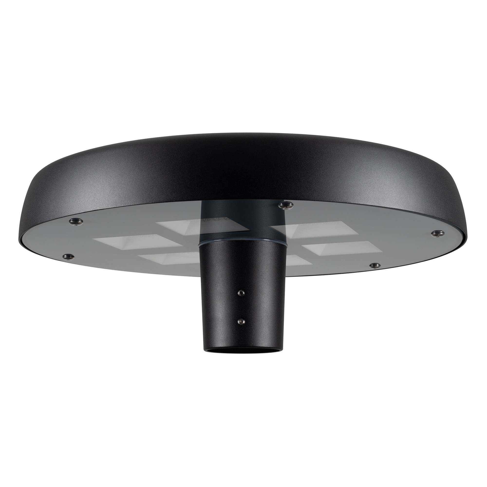 Венчающий светодиодный светильник. Мощность 50 Вт, св. поток 5680 лм, 112 лм/Вт, тёплый 2700 K, CRI>80, угол 140°, напряжение питания 230 В. Черный корпус из алюминия, экран закаленное стекло, степень защиты IP65. Размер: диаметр 510 мм, высота 200 мм. Монтаж на вертикальную опору диаметром 76 мм.