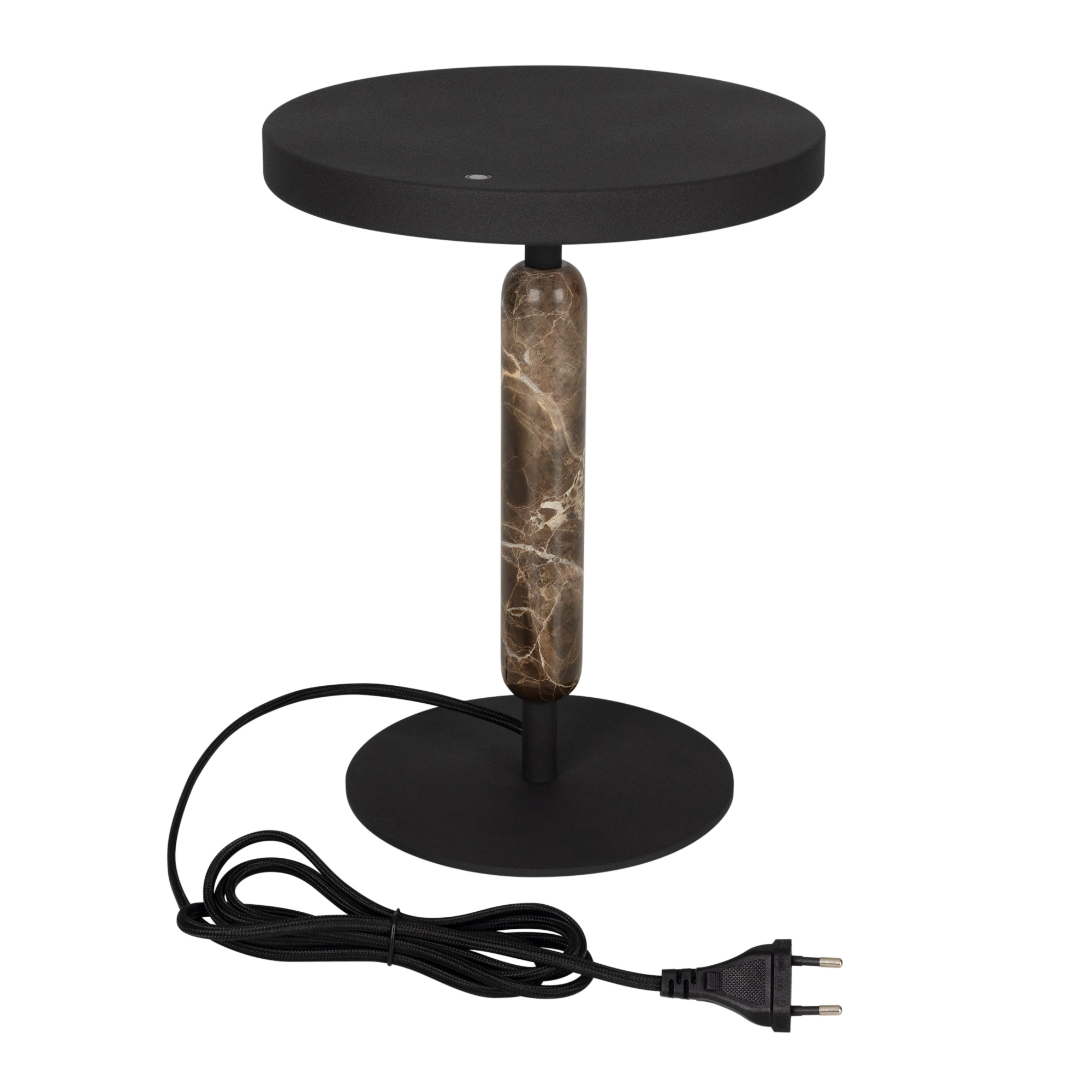 Настольный светильник ALYSS. С изменяемой цветовой температурой 2700/3200/4000К. Цт переключается коротким нажатием на сенсорную кнопку на плафоне, диммирование происходит за счет ее удержания. Мощность 5 Вт, св. поток 195 лм, 39 лм/Вт, CRI>92, угол 110°, напряжение питания 230 В. Черный корпус из алюминия, декоративная вставка из мрамора, степень защиты IP20. Размер: диаметр 225 мм, высота 300 мм. Пульсация <1%.