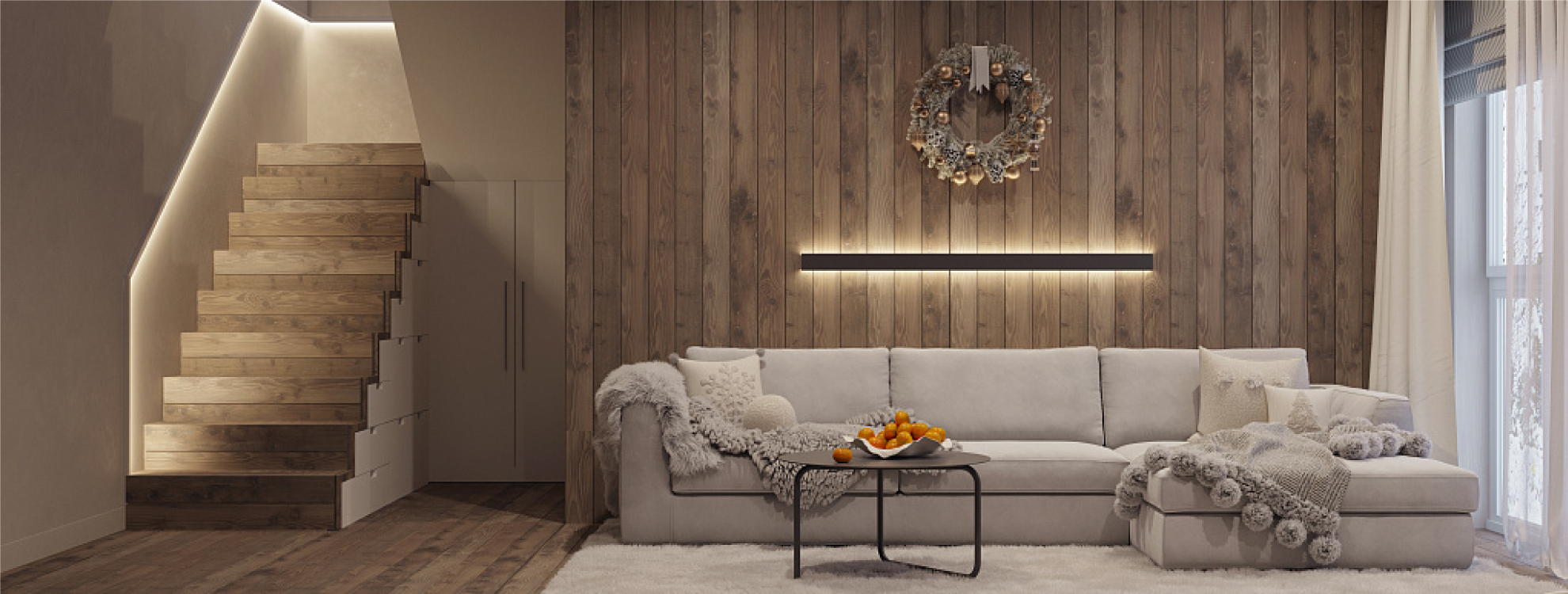 Профили можно располагать как горизонтально, в виде настенных светильников разной длины, так и вертикально — для зонирования пространства. Также можно использовать профиль в виде декоративного поручня для оформления лестничного пролета.