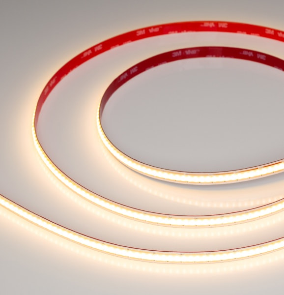 Ленты серии COB — одни из самых любимых у клиентов Arlight, потому что образуют сплошное равномерное свечение даже без применения рассеивающих экранов.