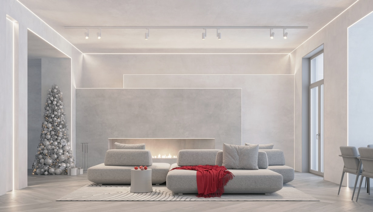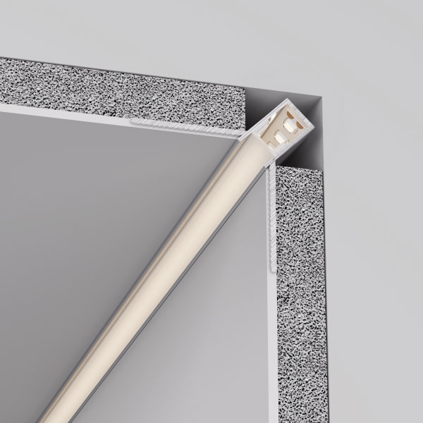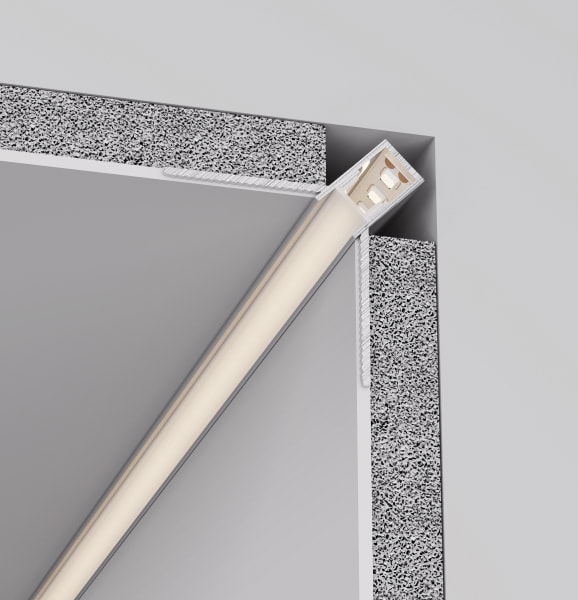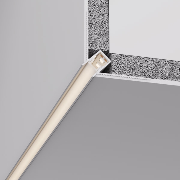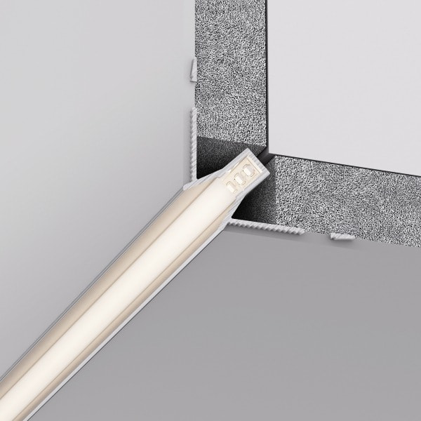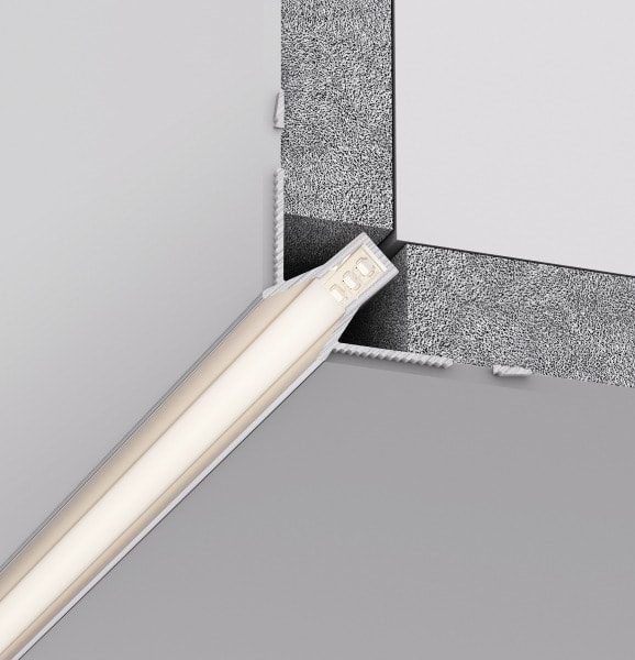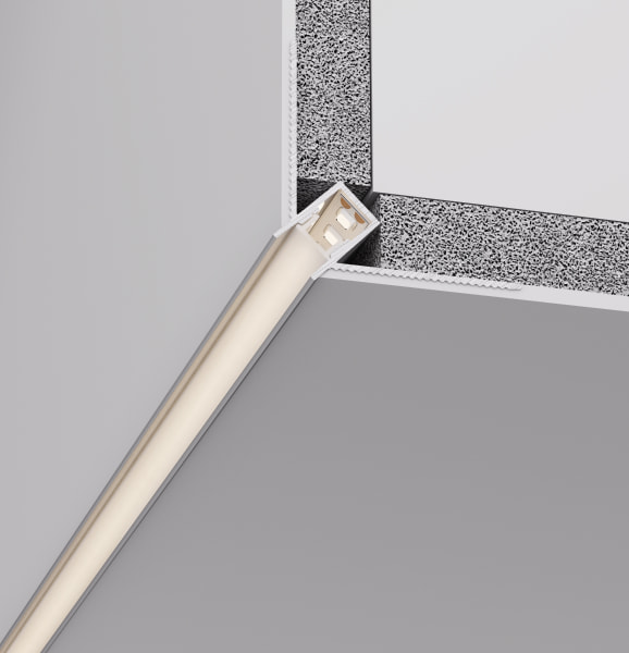Углы тоже могут стать эффектным элементом в интерьере. Выделите контуры пространства изящной подсветкой на основе встраиваемых угловых профилей DECORE S6 COMFORT со скрытым фланцем.