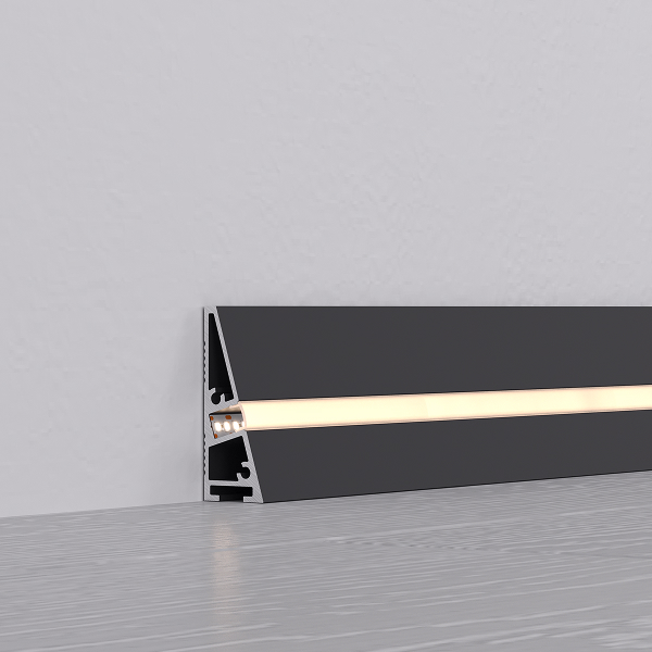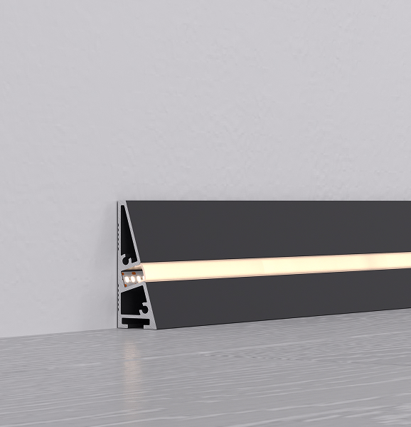 Накладной алюминиевый профиль-плинтус треугольной формы серии PLINTUS H40 — практичный выбор для современного интерьера. Профиль не только скроет зазор между стеной и полом, придав стильный вид пространству, но и создаст уютную атмосферу благодаря мягкому рассеянному свету.