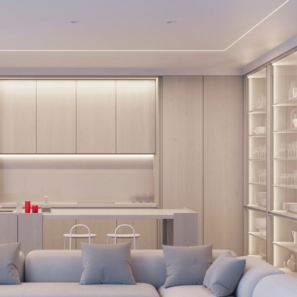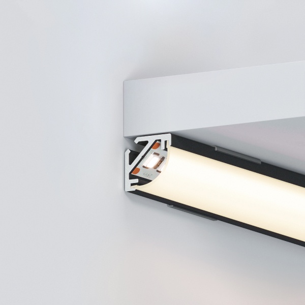 Угловые мини-профили KANT отлично подходят для создания контурной подсветки по углам полок, ниш и других элементов интерьера.