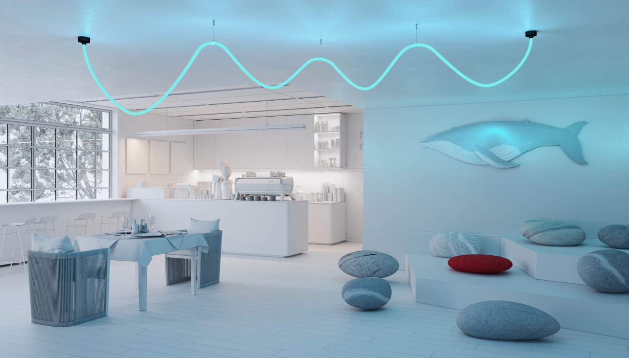 Эпатажная гостиная в тропическом стиле, а может, минималистичный кабинет с ярким световым акцентом? Светильник со свечением 360° из гибкого силиконового профиля WPH FLEX ROPE станет не только элементом локального освещения, но и стильной декоративной инсталляцией.