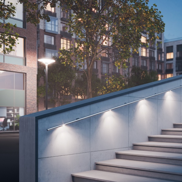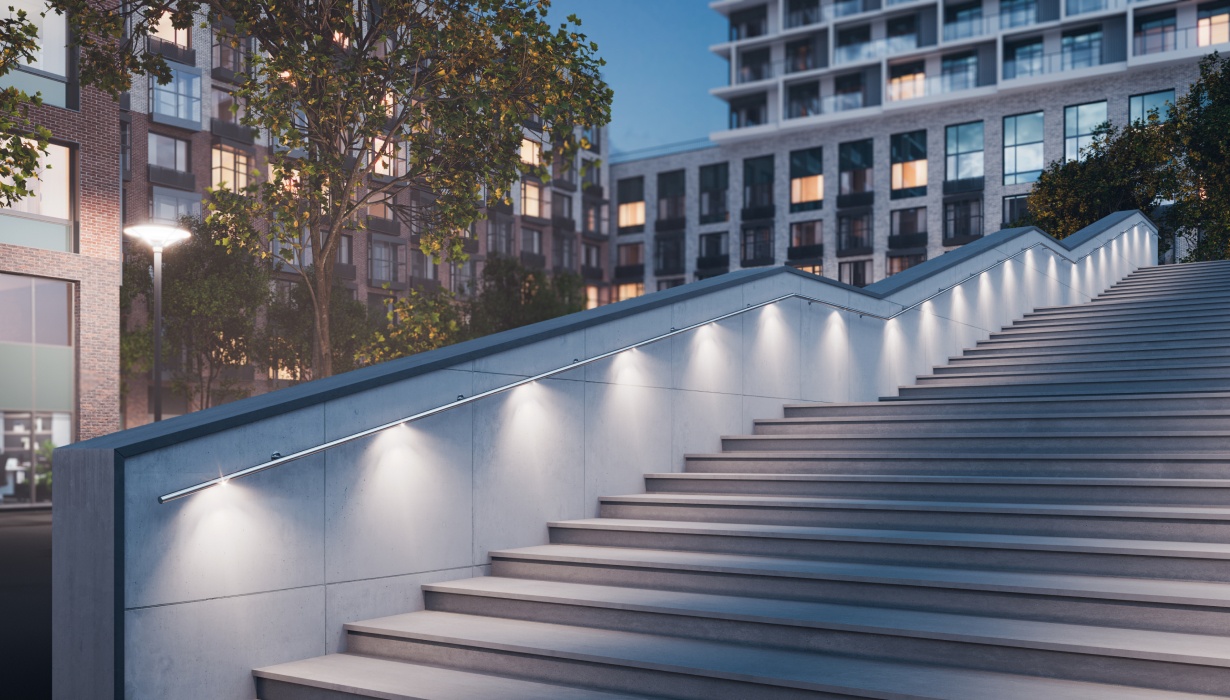 Светильник с углом излучения 70° или 30×60° позволяет организовать функциональное освещение лестничных маршей, балконов, террас и архитектурных элементов, где используются ограждения и поручни.