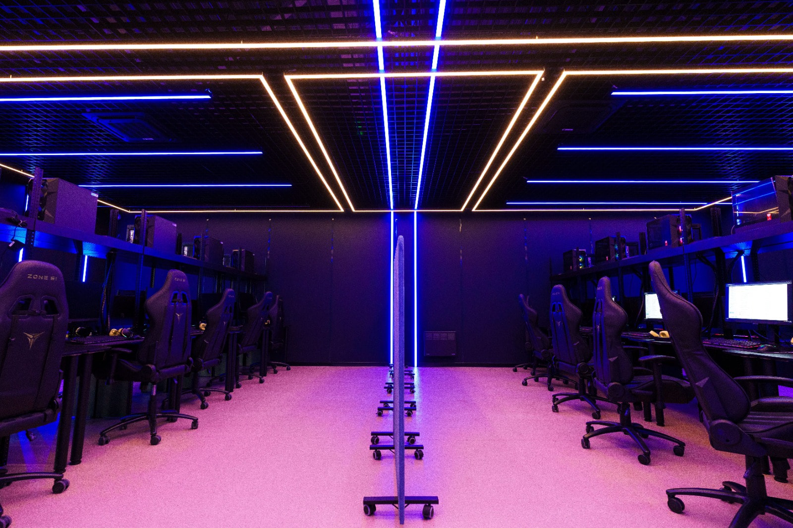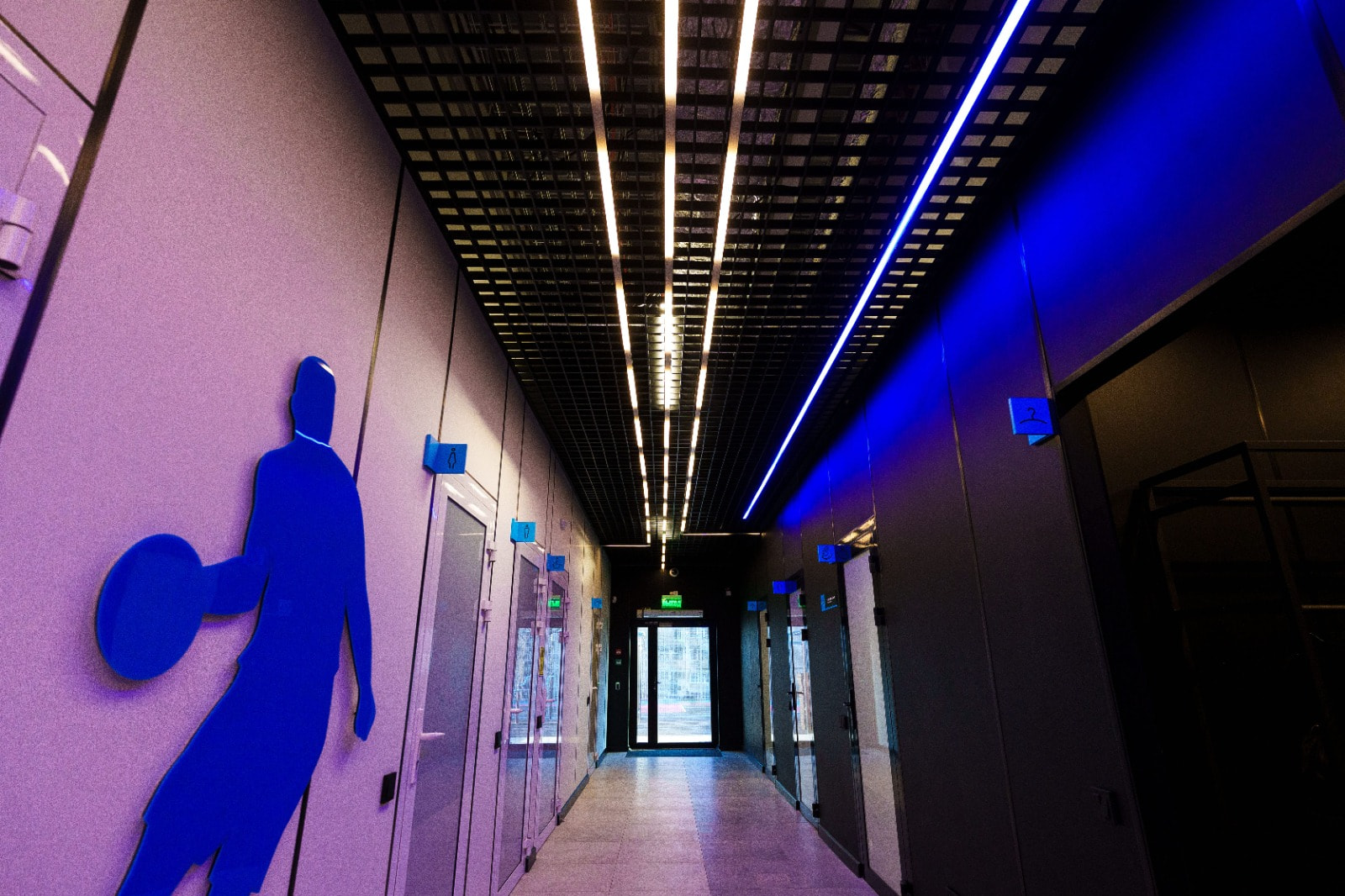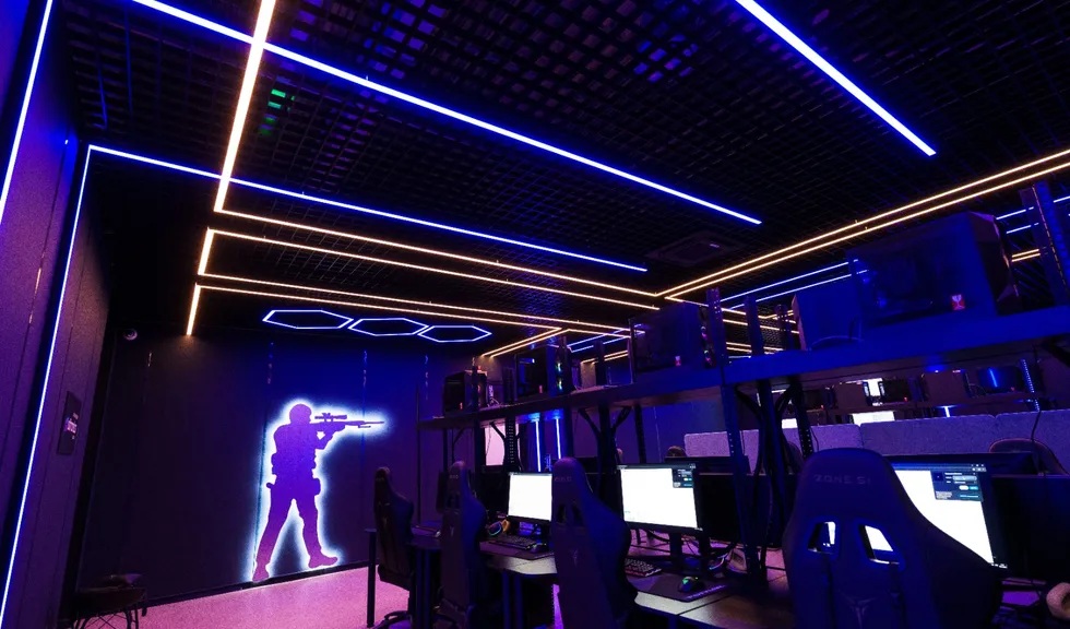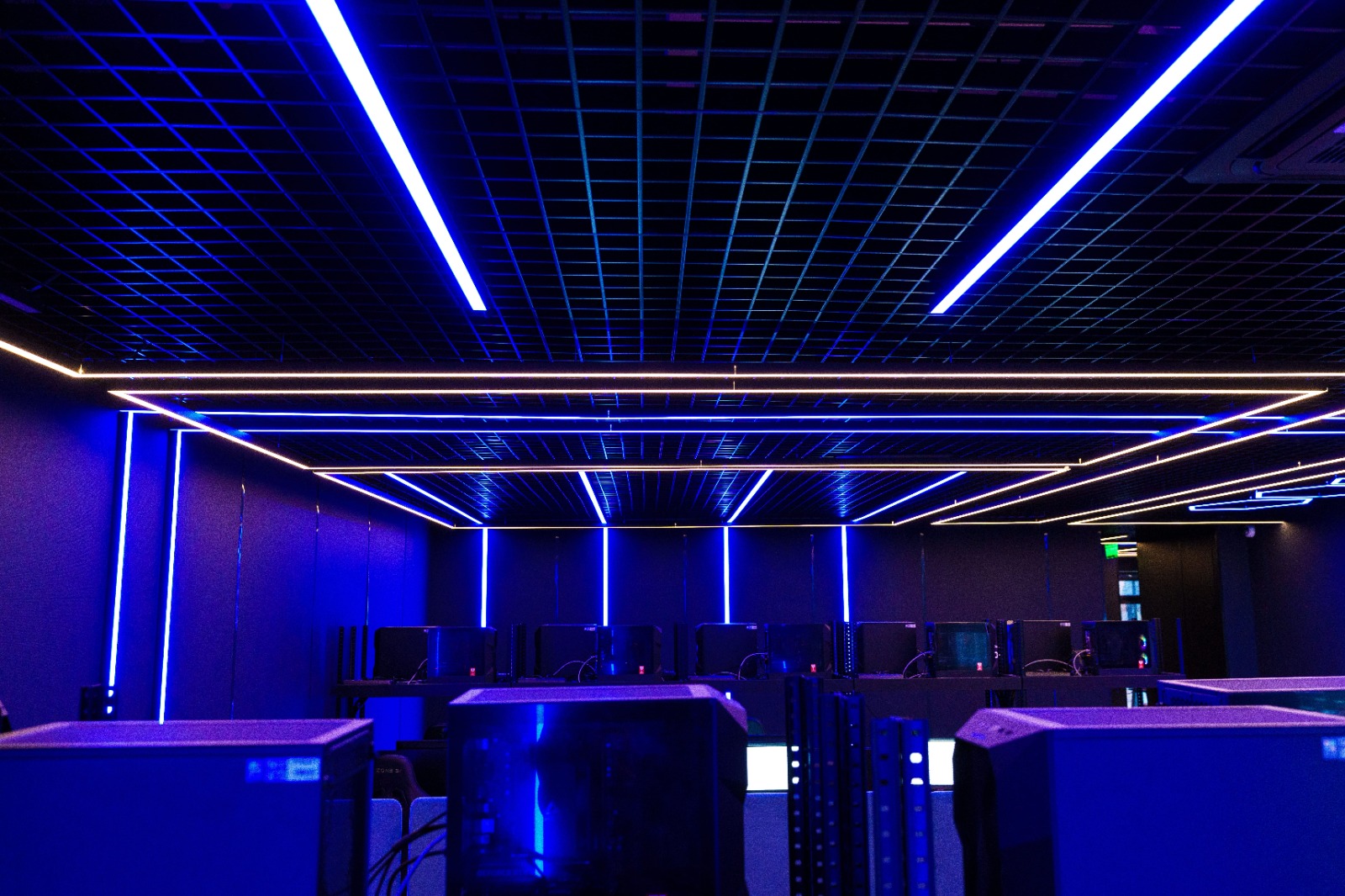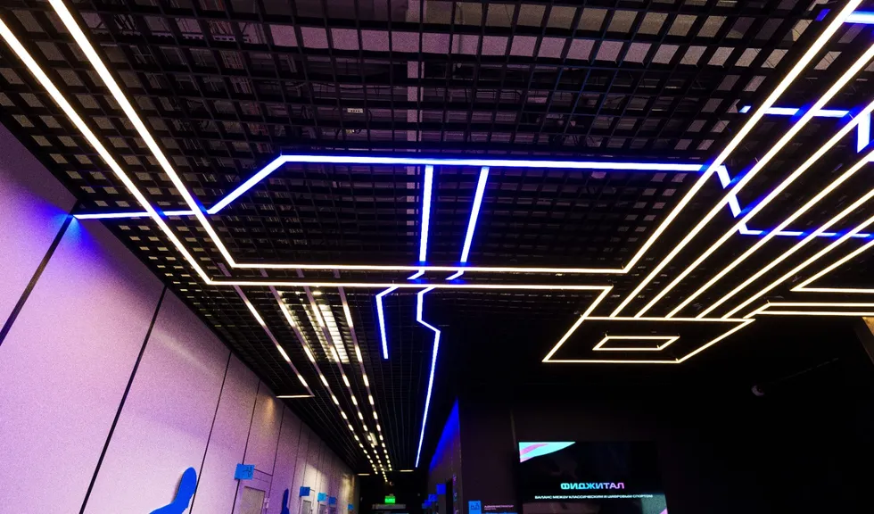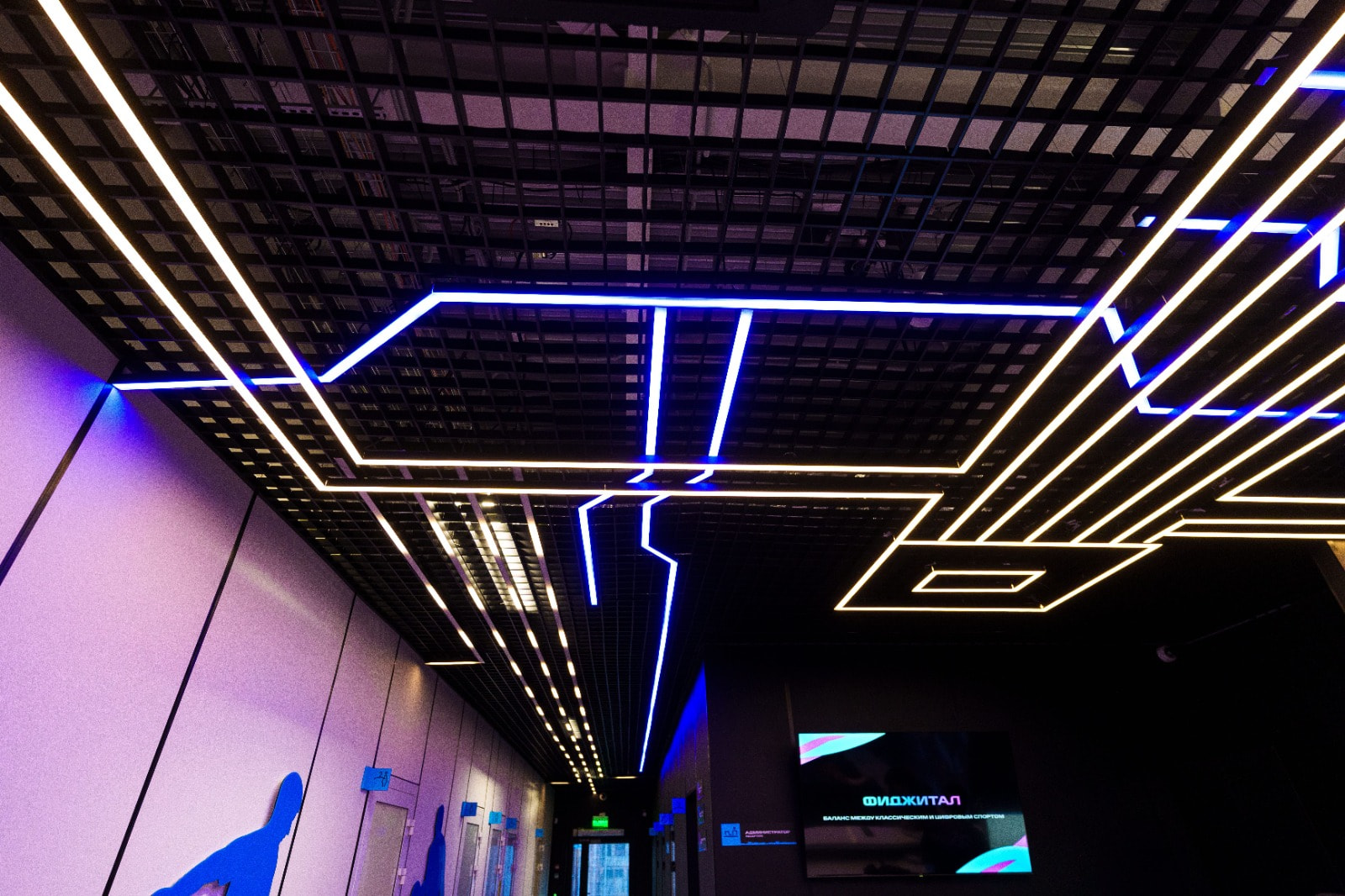Геометрические фигуры из линейных профильных светильников со светодиодной лентой серий RTW и MOONLIGHT отлично вписываются в пространство центра. Минималистичные во внешнем исполнении, они создают основное освещение.