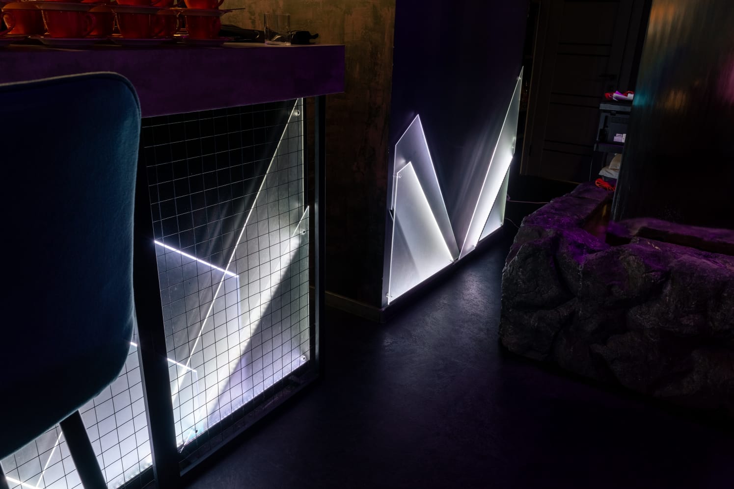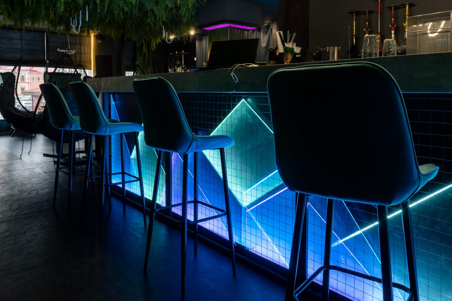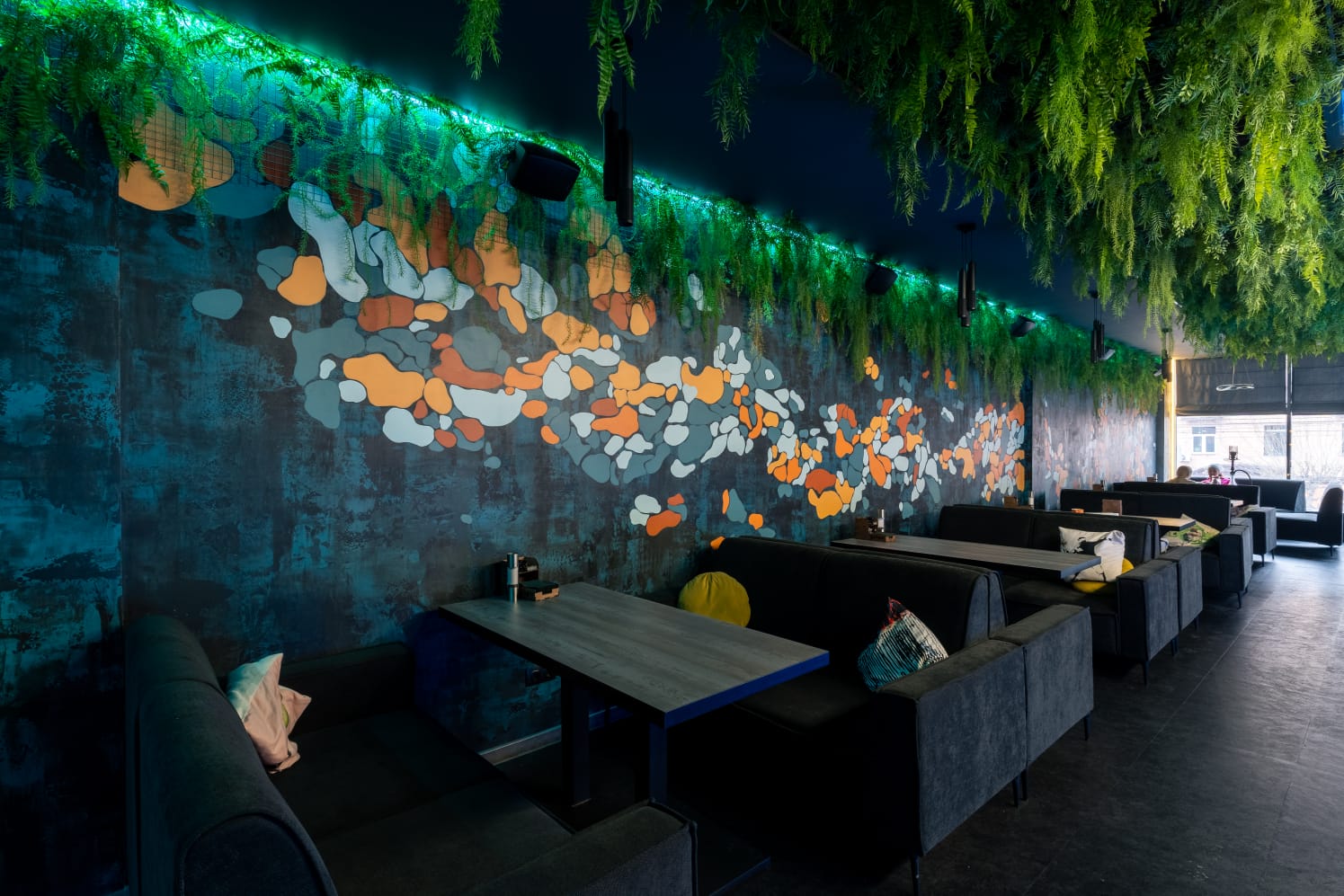Абстрактные разноцветные пятна на одной из стен создают расслабляющее и легкое настроение. RGB-подсветка обеспечивает дополнительный акцент. Возможность выбора любого цвета свечения позволяет задать в кальянной нужное настроение.
