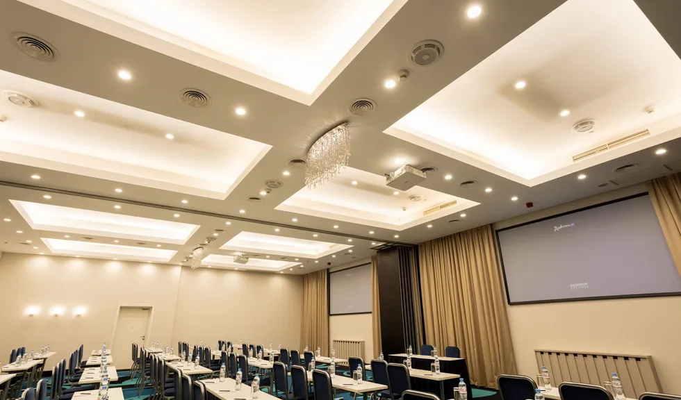 Освещение конференц-зала проектируется с учетом многофункциональности пространства: в нем проводят презентации, видеоконференции, совещания и торжественные мероприятия. Применение световых сценариев — один из ключевых пунктов для создания такого многообразия.