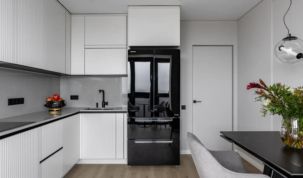 В дизайне кухни концепция минимализма достигла своего пика. Для основного освещения используются магнитные треки ORIENT и светильники FLAT. Тонкая линия трека, встроенного в потолок, дополняет аналогичный паттерн на мебели. Гармоническое сочетание вертикальных и горизонтальных темных линий на белом фоне усиливается, когда вспыхивает свет утопленных в черный трек светильников.
