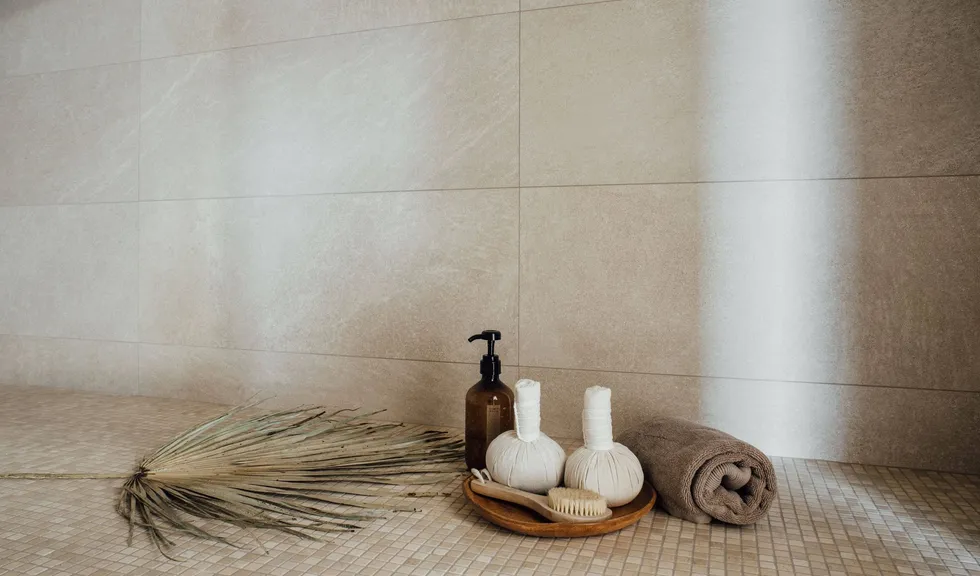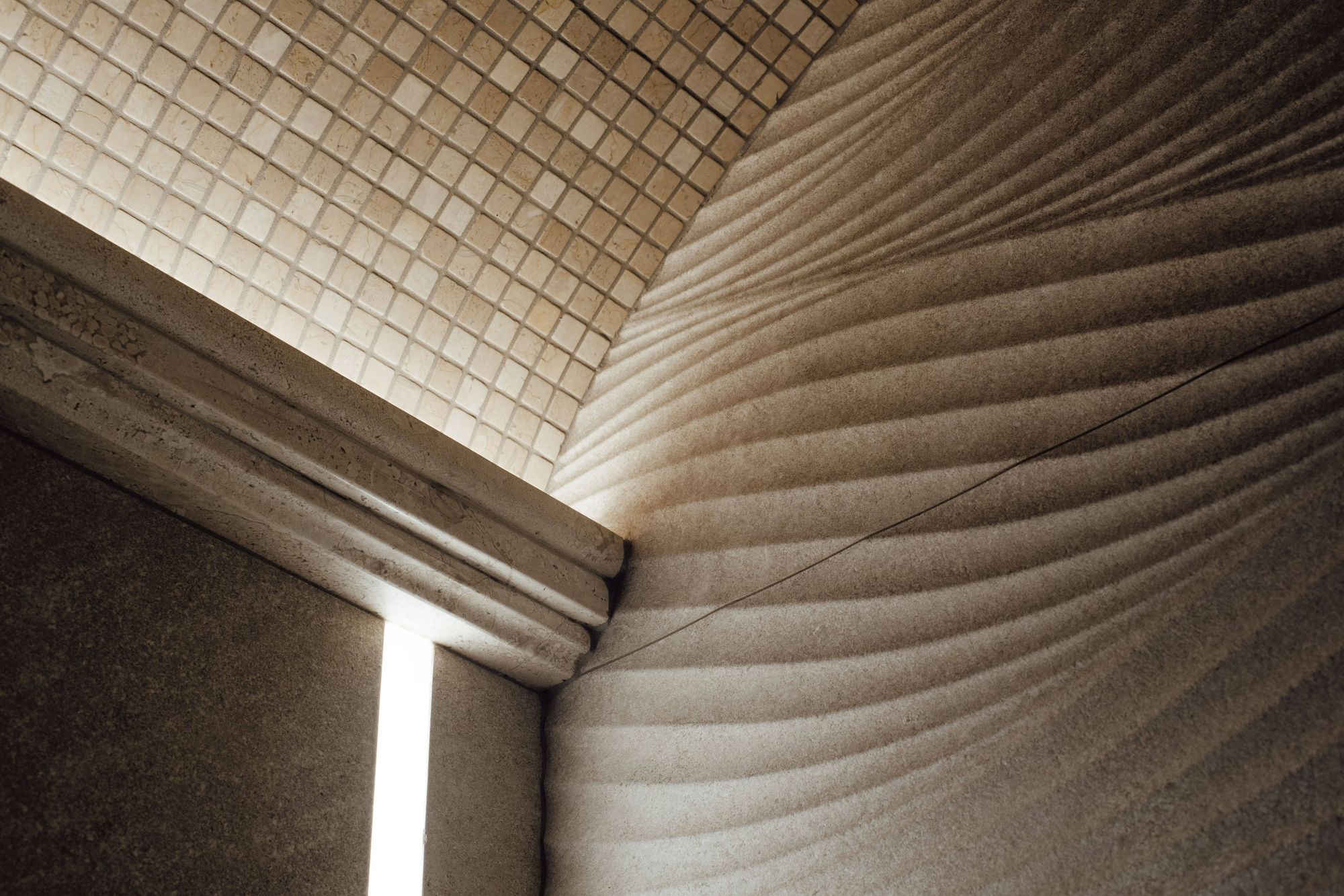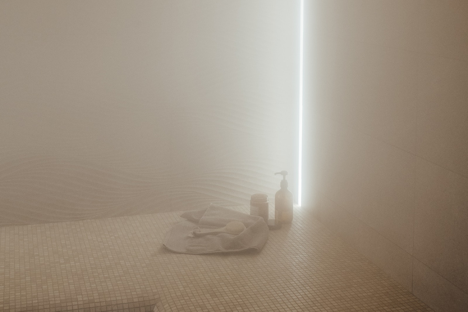 Монохромность и отсутствие ярких цветовых акцентов в интерьере хаммама способствуют созданию умиротворяющей атмосферы. При этом интерьер по-восточному нарядный благодаря сочетанию поверхностей с различной фактурой. На скамьях и сводчатом потолке — мелкая мозаика, а на стенах — гладкая текстура мрамора и рельефные плиты, напоминающие песчаные дюны.