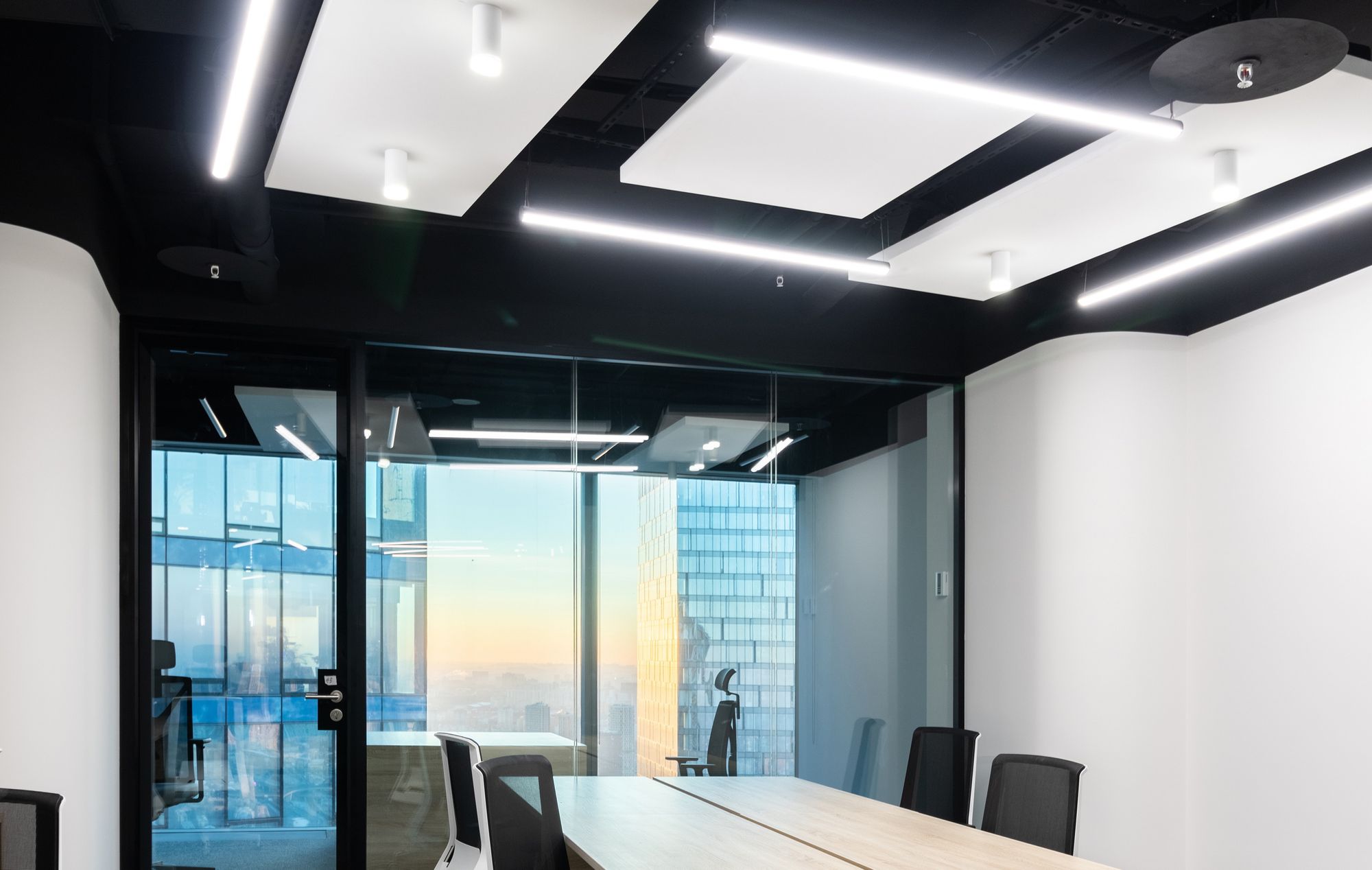 Современный офис с панорамным видом на Москву превратился в уникальное световое пространство. Основным элементом оформления стали подвесные линейные светильники на тросах, при создании которых использовали профиль круглого сечения с матовым экраном. Подвесные светильники не только создают комфортное основное освещение, но и являются дизайнерскими объектами. Для разных зон офиса выбраны разные оттенки белого: теплый белый располагает к комфортному общению, а дневной настраивает на активную работу в течение всего дня. В коридоре использовали встроенные линии света с лентами на черной плате — они очень эффектно смотрятся в помещениях с темными стенами и не выделяются на их фоне. Стильные и оригинальные светильники в виде колец собраны из профилей и широкой светодиодной ленты. В деревянные перегородки заложили линии света, подчеркнув благородную текстуру натурального дерева.