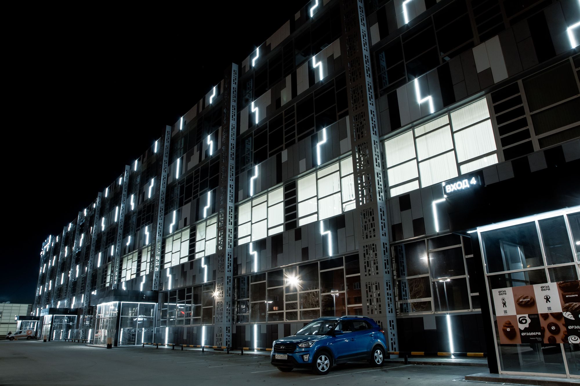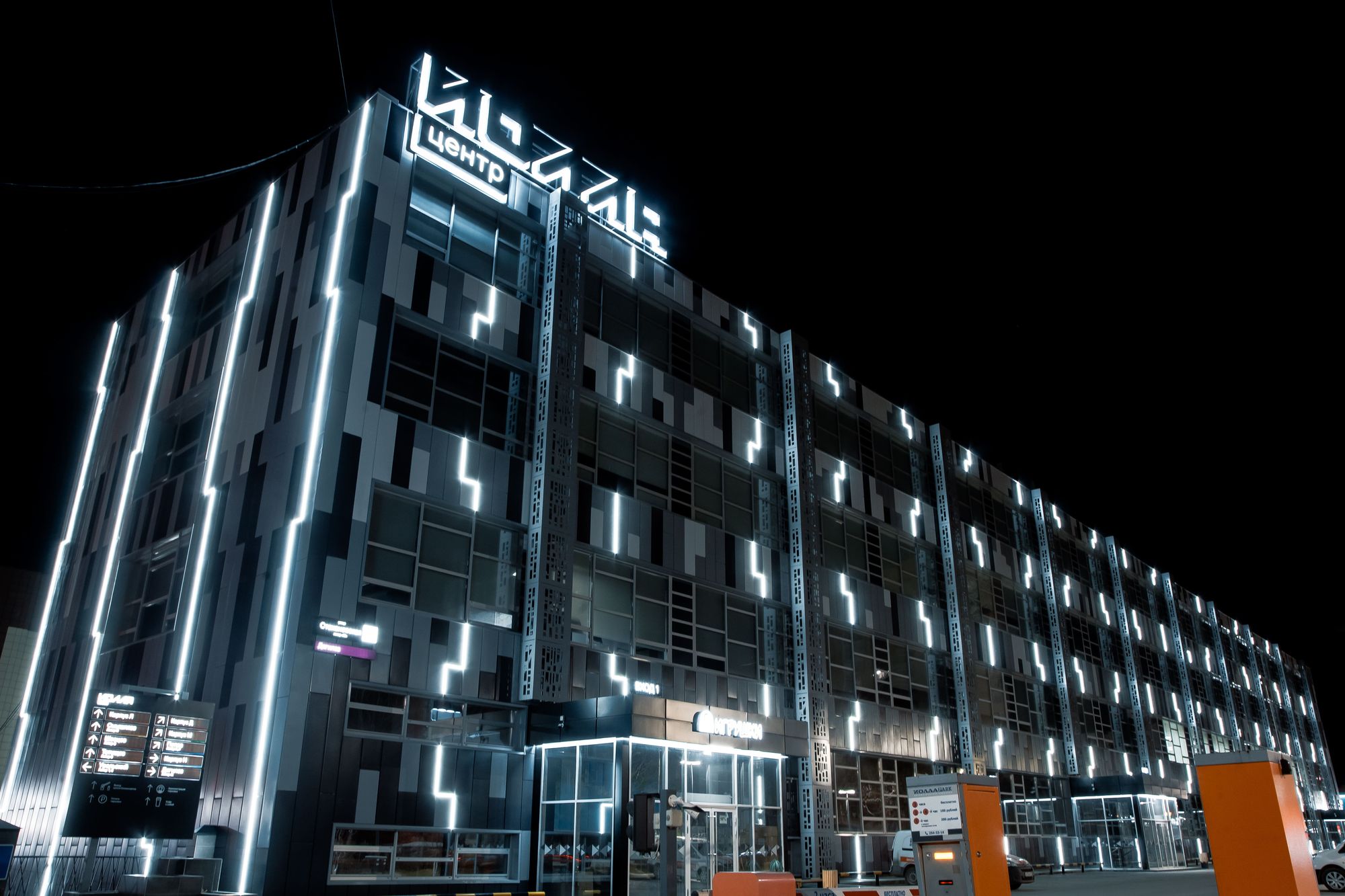 Однотонная подсветка выполнена в холодном цвете свечения (6000 К). Данная цветовая температура гармонирует с серо-голубой гаммой облицовки фасада, а также придает зданию выдержанность.