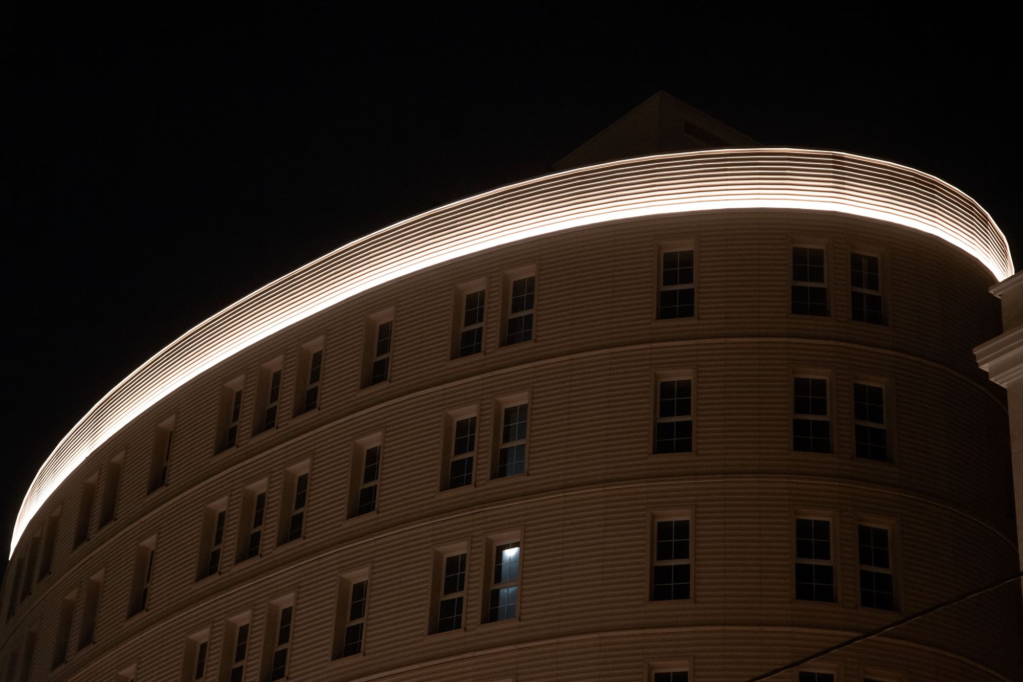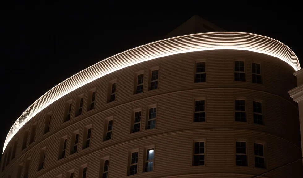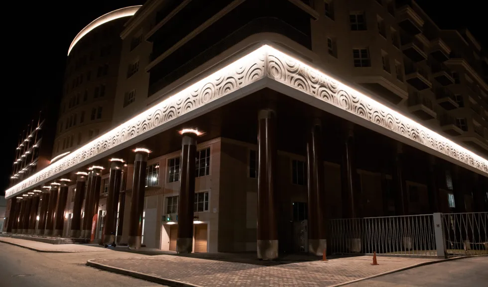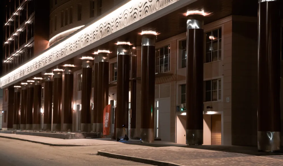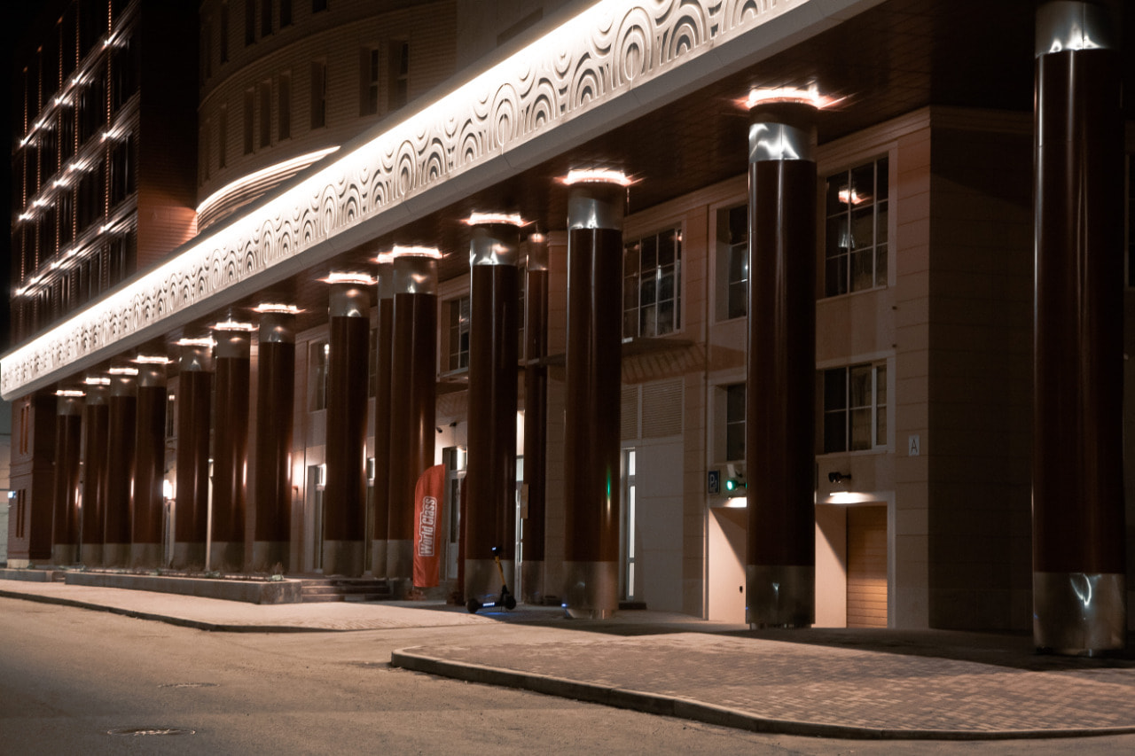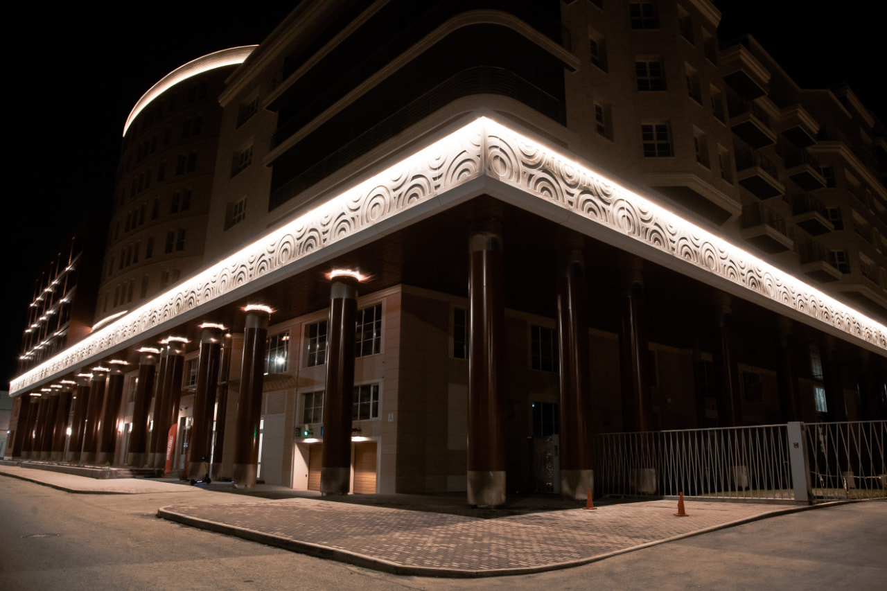 Подсветка фасадов выполнена на основе герметичной светодиодной ленты ARL PV C72 с цветовой температурой 3000 К. Теплый белый цвет свечения создает уютный и умиротворяющий облик здания и хорошо подходит для акцента классических декоративных элементов. Округлый орнамент на фризе оживает в свете подсветки, а рифленая поверхность фасада приобретает объем. Широкая подсветка верхнего и нижнего контура одного из корпусов плавно очерчивает строение в темное время суток.