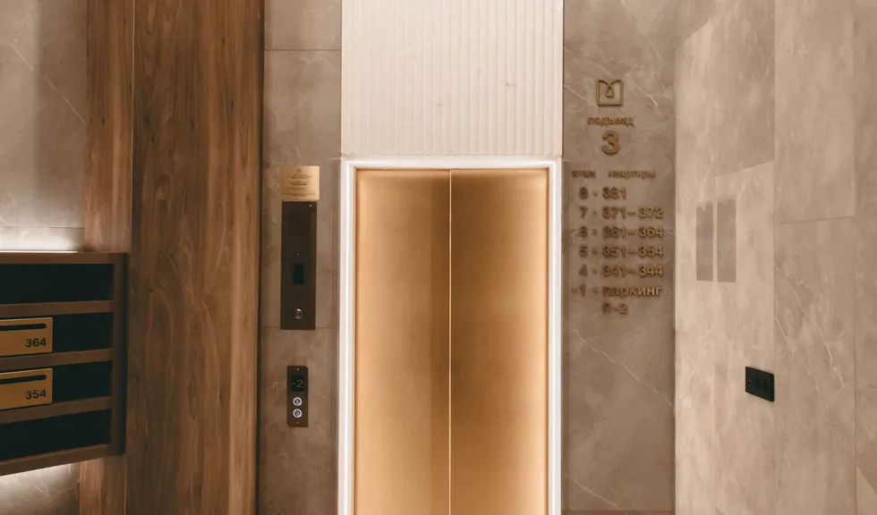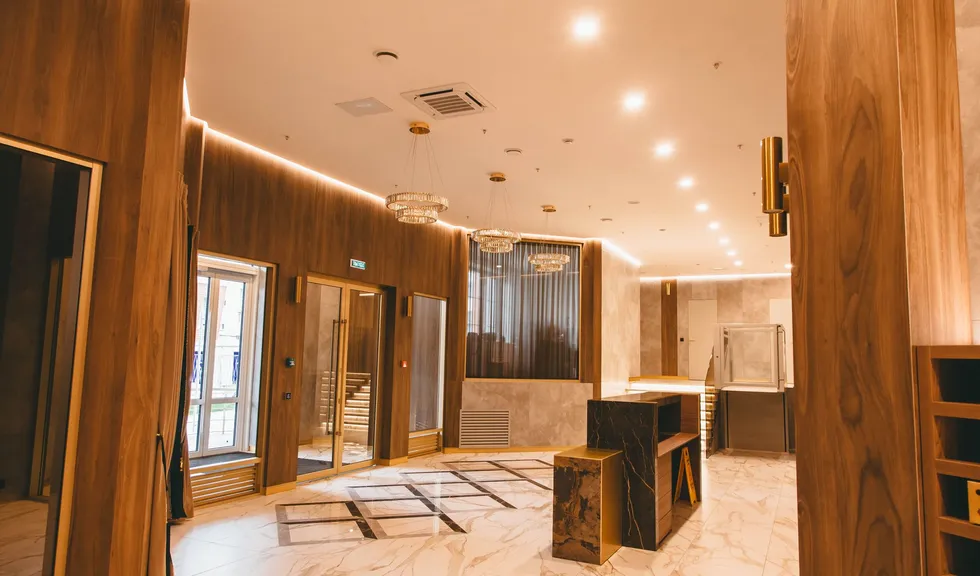 Отделка одного из лобби в ЖК «Москва» выполнена с помощью каменного шпона, что придает интерьеру определенный статус. Однако, чтобы пространство не казалось тяжеловесным и перегруженным, потолок по периметру очерчен линией света. Это не только подчеркивает сложную геометрию помещения, но и наполняет пространство воздухом.