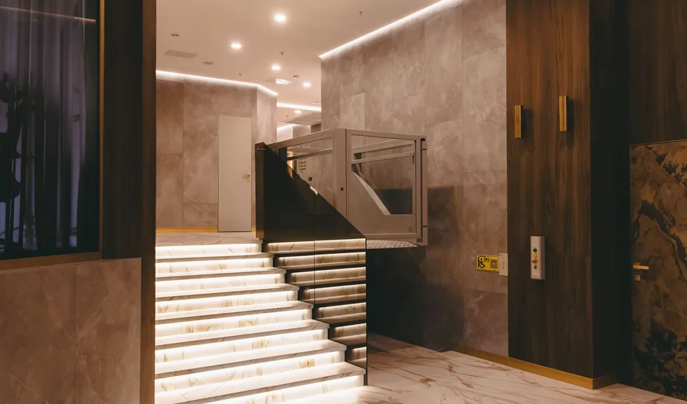 Еще больше света и легкости привносит индивидуальная подсветка над каждой дверью в квартиру. Встраиваемый профиль PDS в цвете шампань гармонично вписывается в деревянную отделку, а светодиодная лента COB с мощностью всего 4 Вт/м создает ненавязчивое свечение.