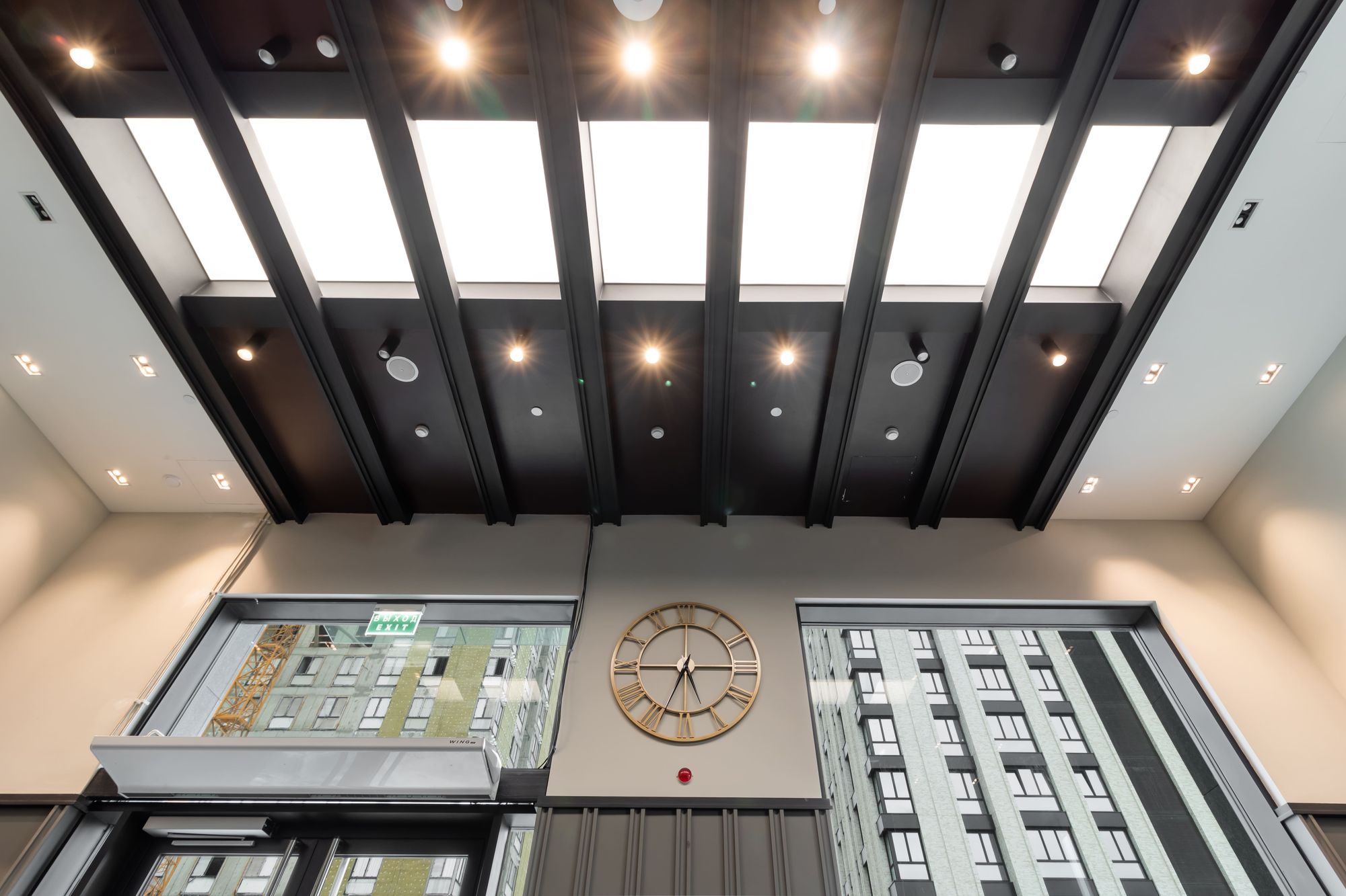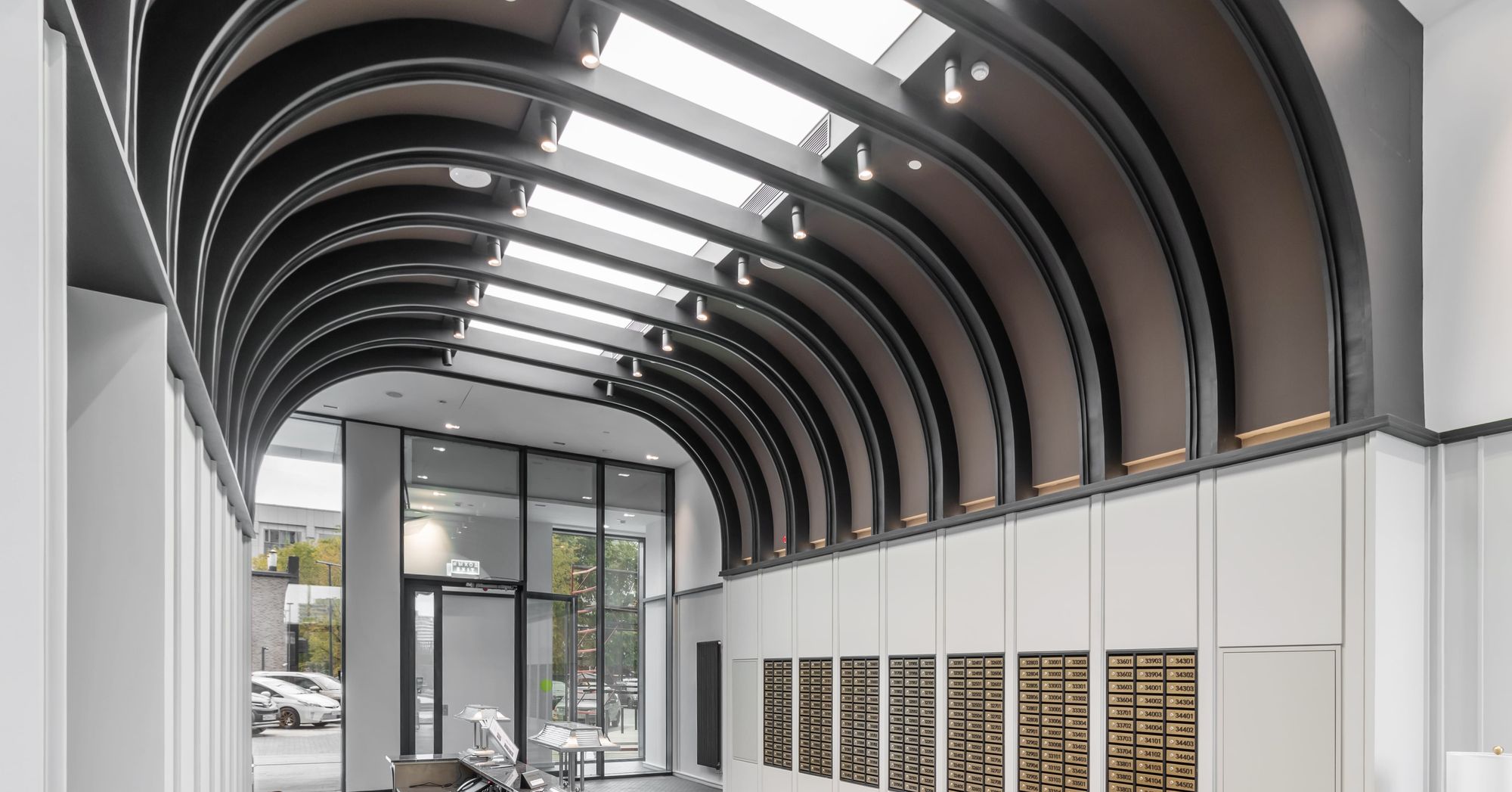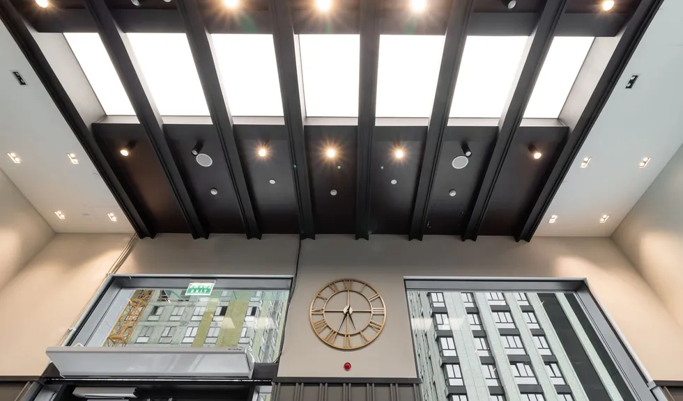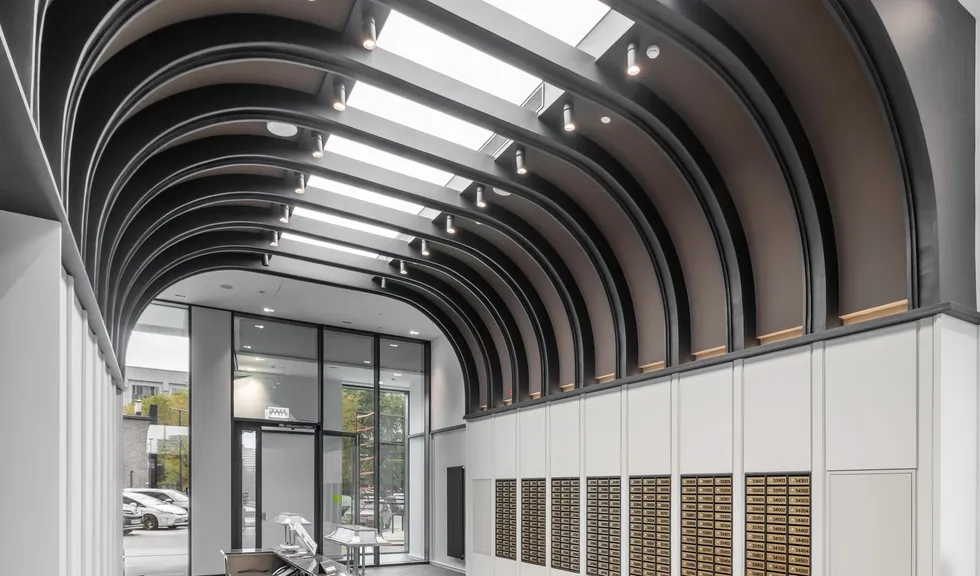 Основное освещение в лобби и коридорах создано за счет встраиваемых карданных светильников KARDAN. Наподобие свету в кино, данные светильники сделают световой акцент там, где он нужен: благодаря узкому углу излучения (38°) и одному или двум поворотным модулям, отклоняющимся на 45°.
