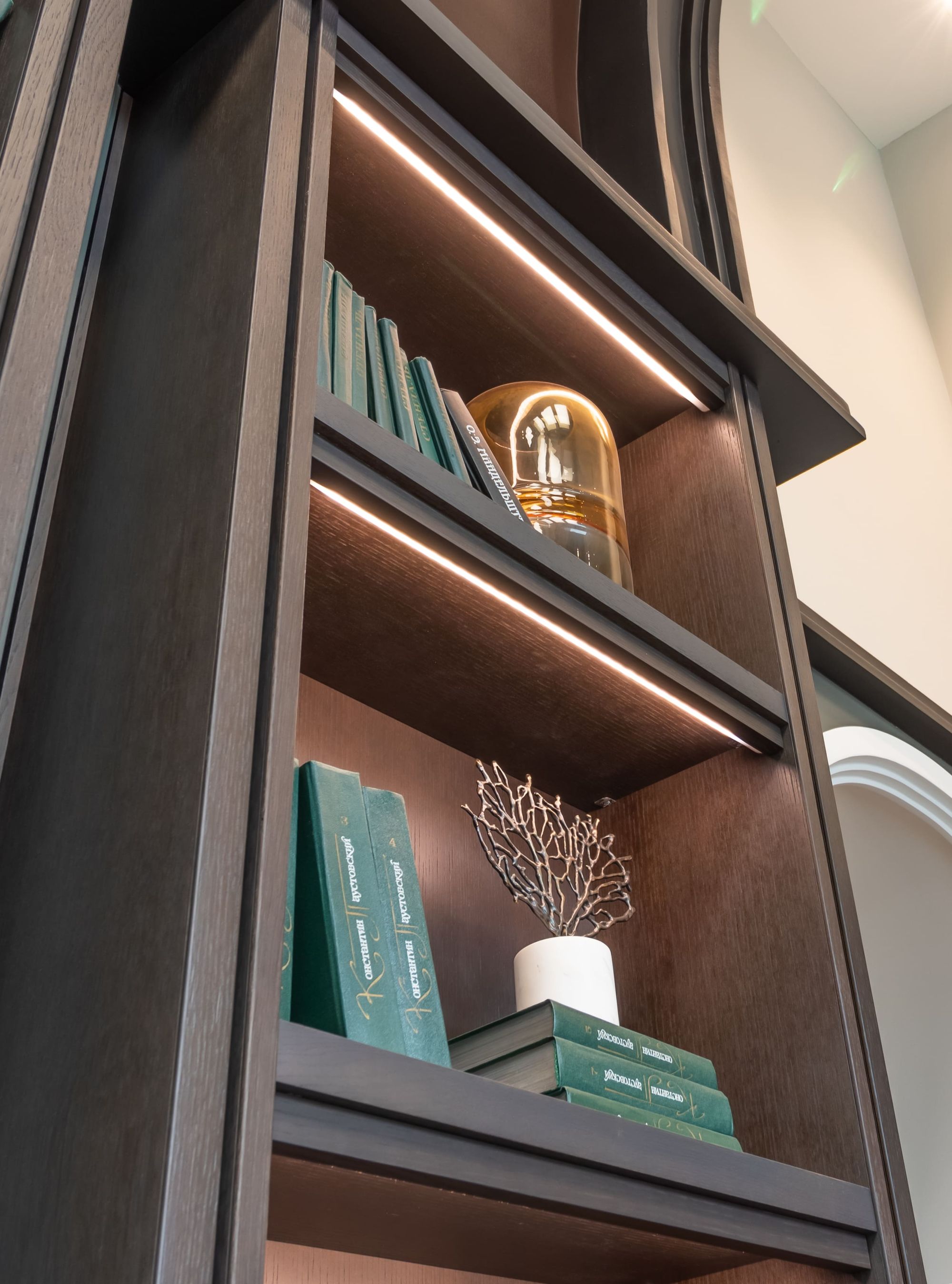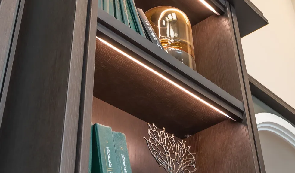 Шкафы и полки создают в лобби уютную и домашнюю атмосферу, поэтому и подсветка для них была выбрана соответствующая — с теплым белым свечением (3000 К).